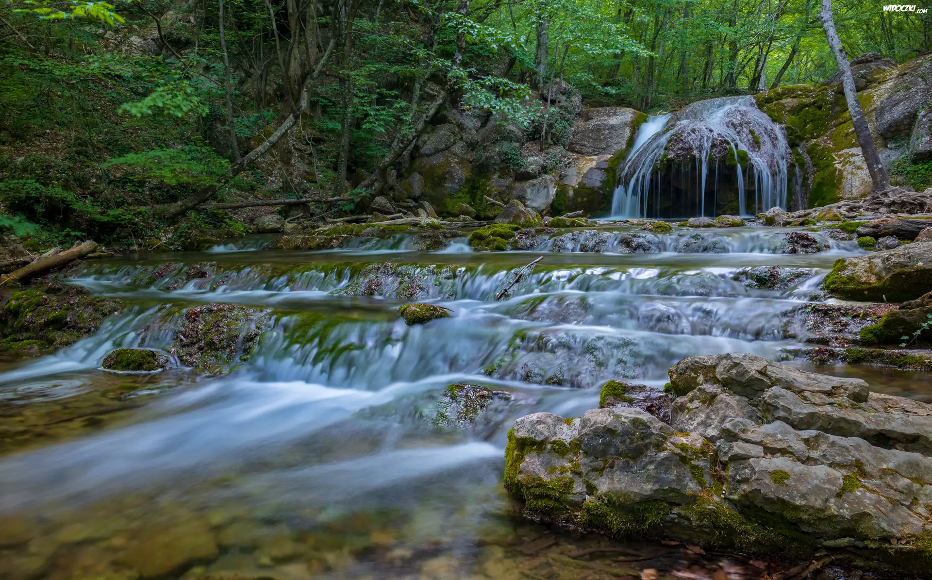 Zdjęcia, Las, Drzewa, Kaskada, Wodospad, Skały, Kamienie