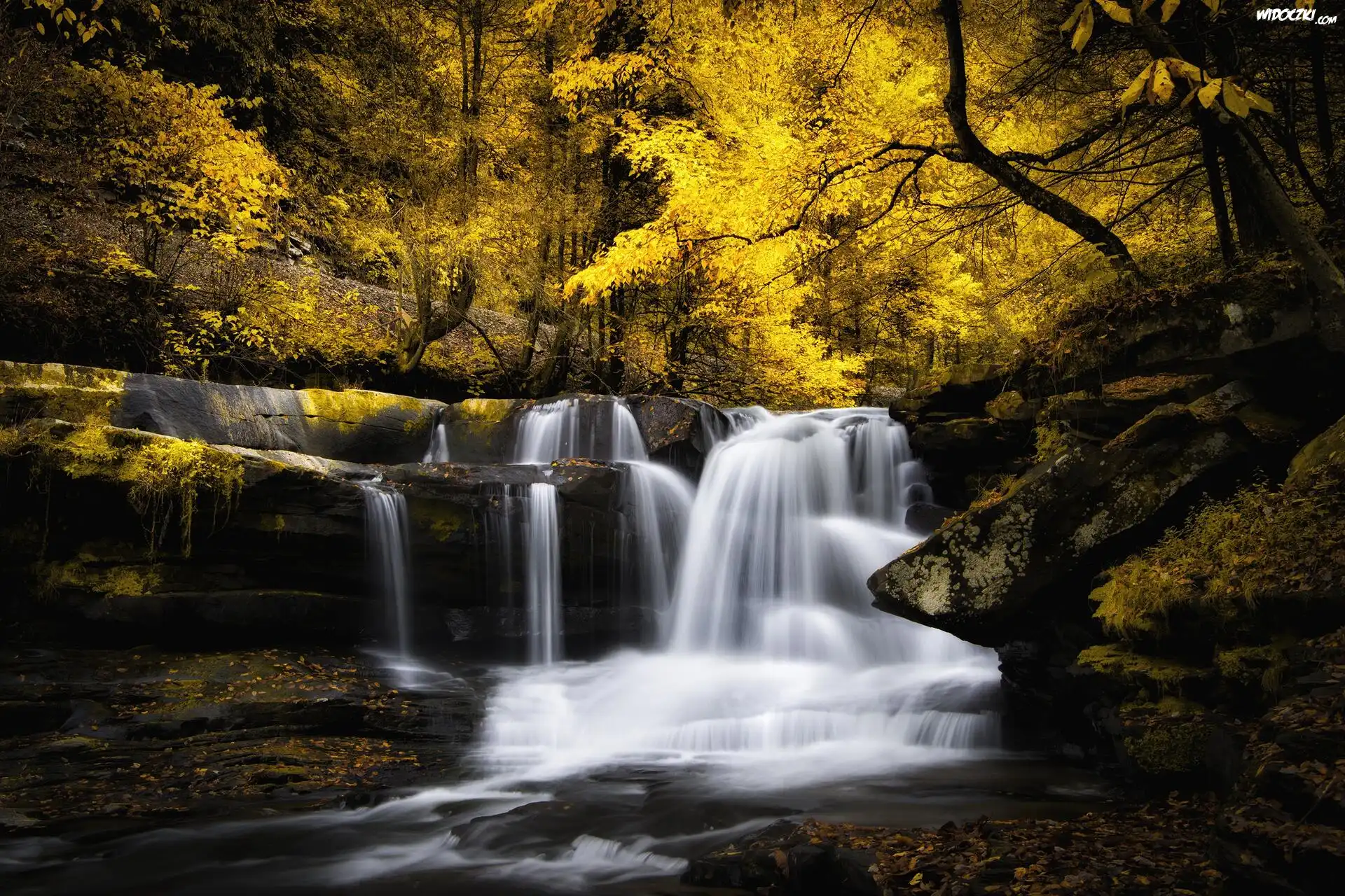 Zdjęcia, Las, Drzewa, Wodospad, Skały, Jesień