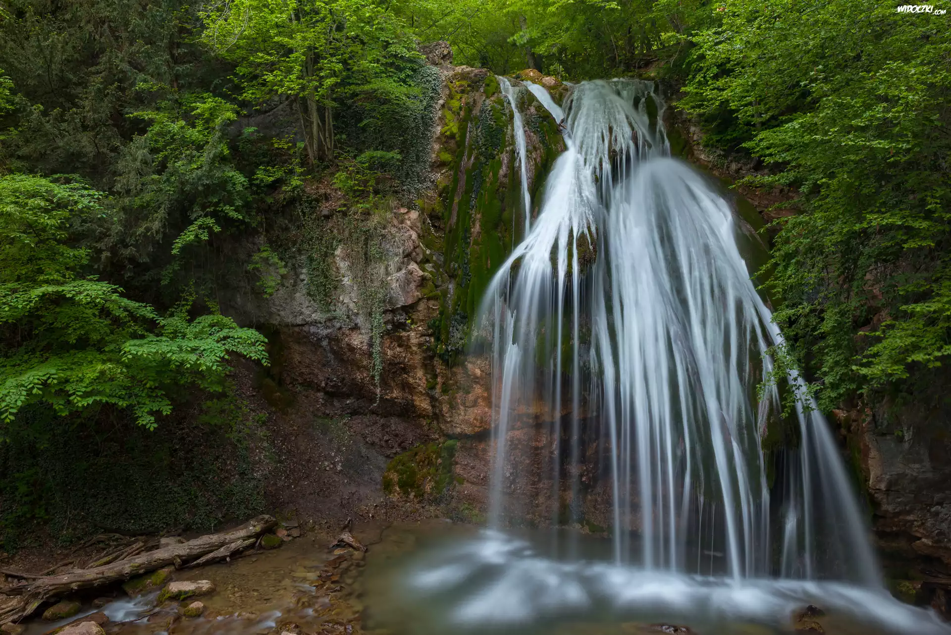 Zdjęcia, Las, Rzeka, Wodospad, Skały, Rośliny