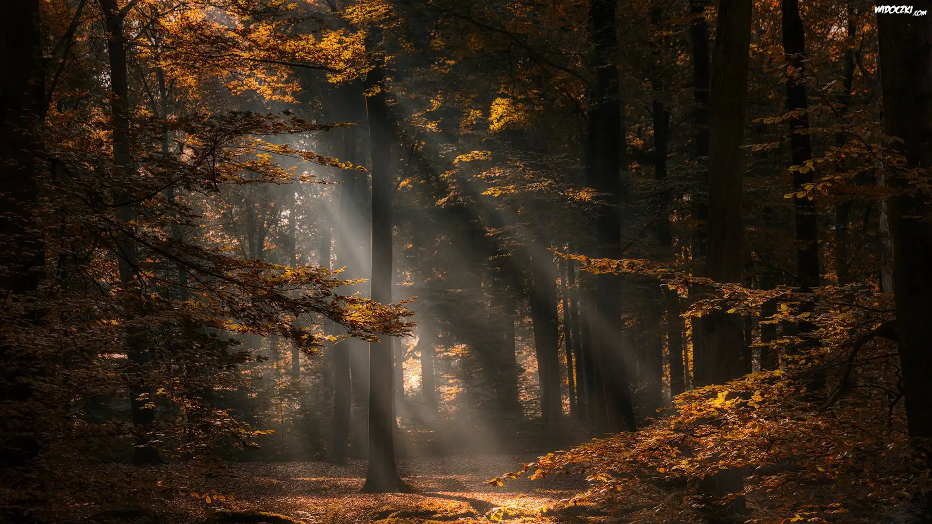 Zdjęcia, Las, Drzewa, Promienie słońca, Jesień