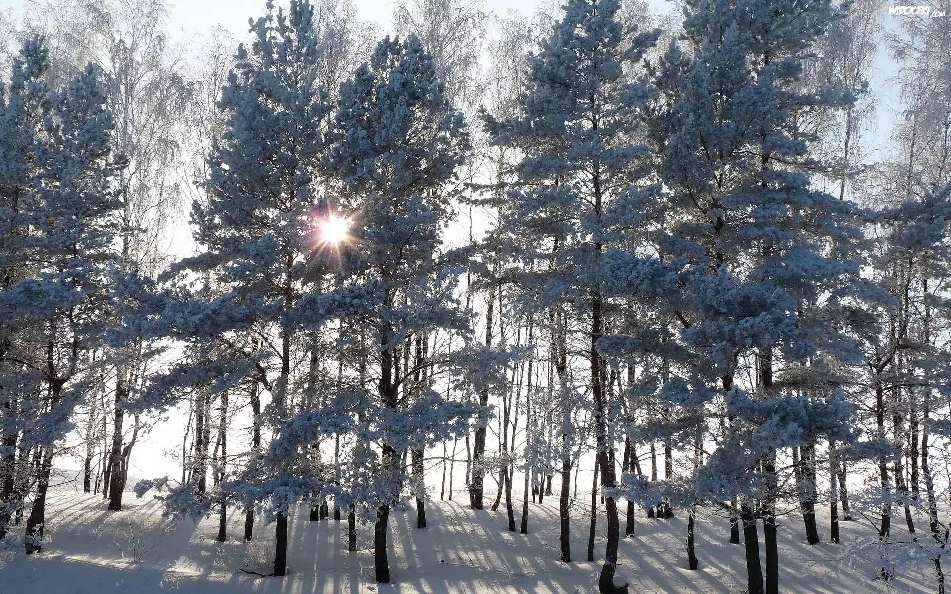 Zdjęcia, Las, Drzewa, Promienie, Słońca, Zima