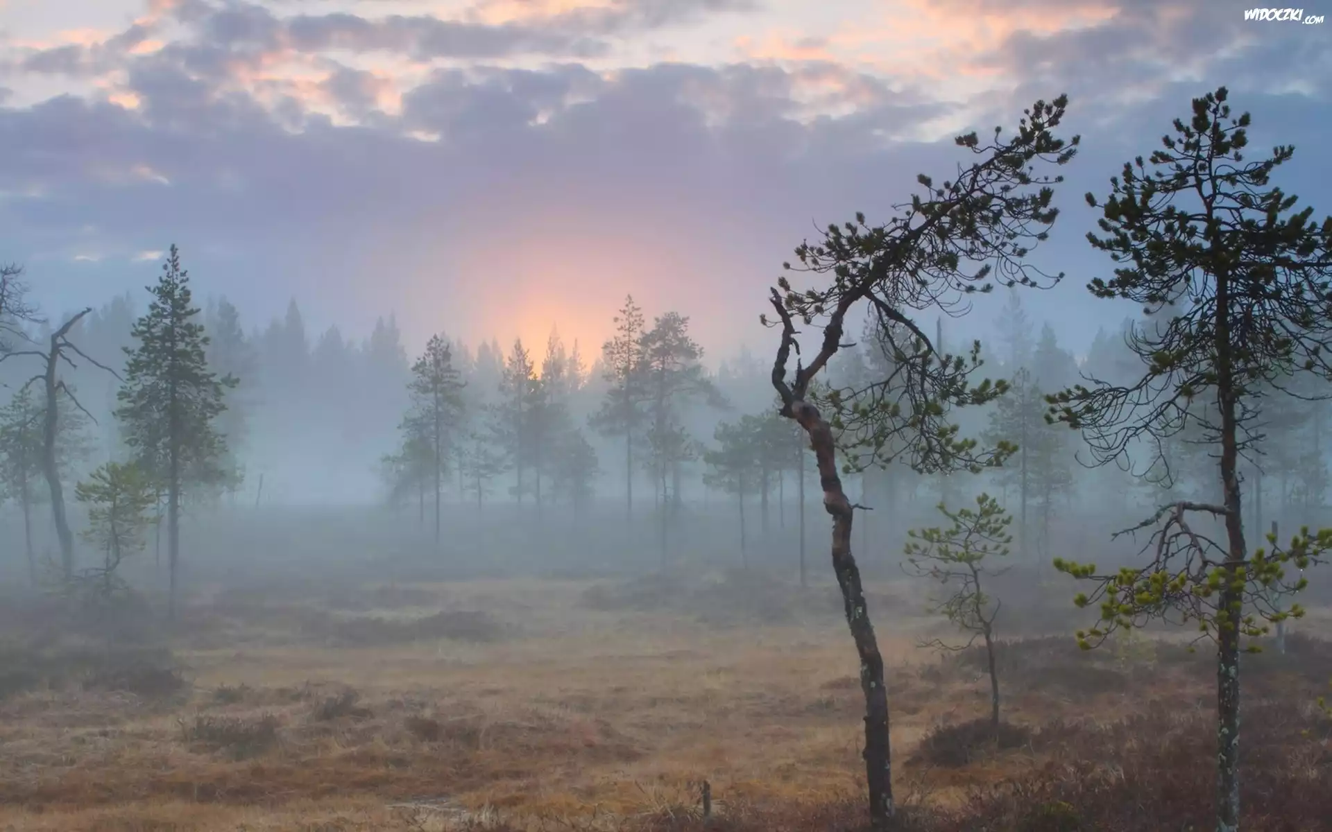 Zdjęcia, Las, Zachód Słońca, Mgła