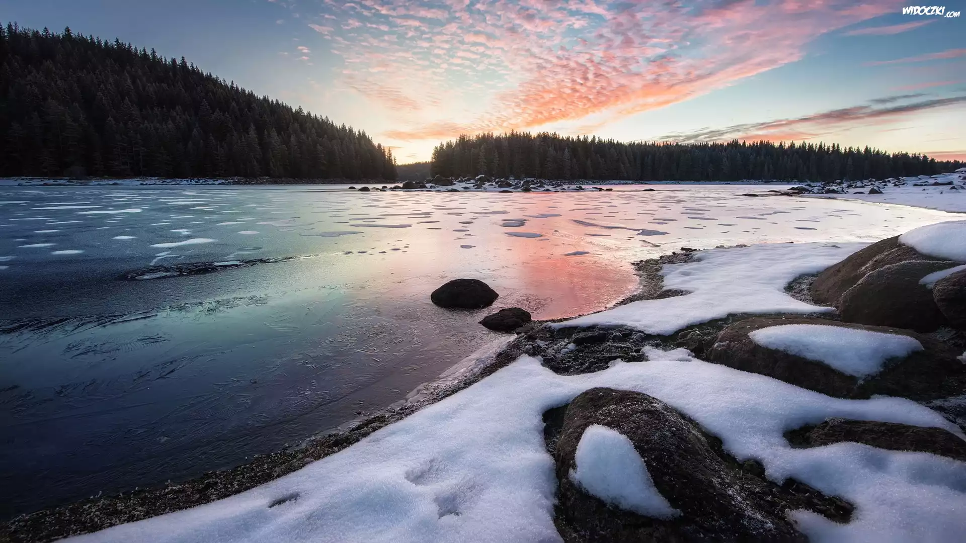 Zdjęcia, Zima, Las, Jezioro, Kamienie, Niebo, Chmury, Wschód słońca