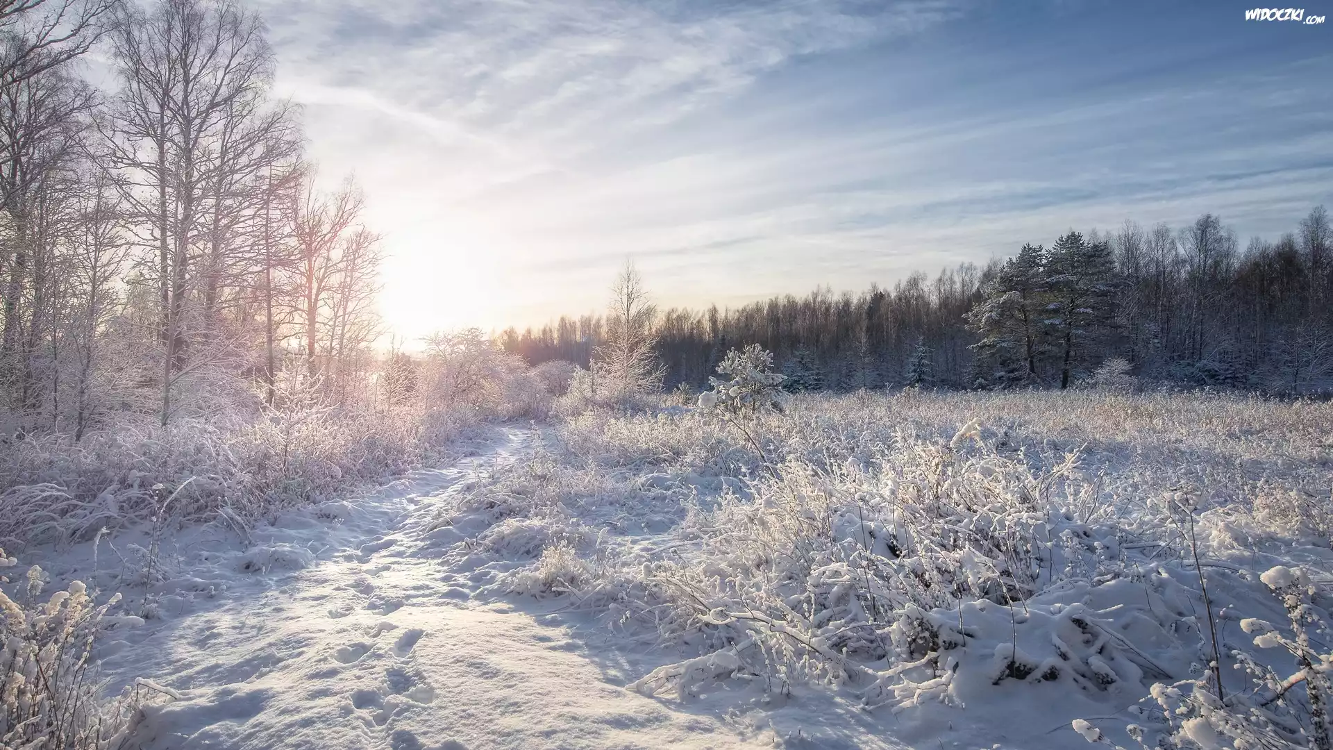 Zima, Las, Oszronione, Drzewa, Trawa, Polana, Wschód słońca