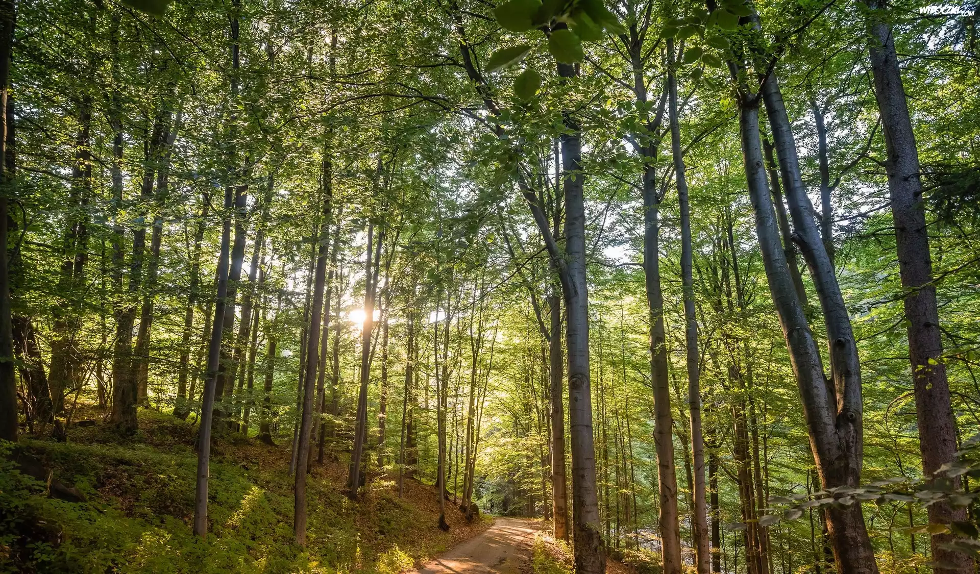 Zdjęcia, Las, Drzewa, Słońce, Dróżka