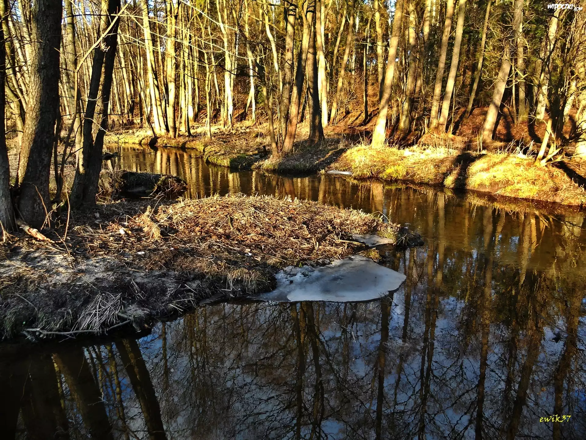 Zdjęcia, Las, Rzeczka, Drzewa, Przebijające, Słońce, Lód