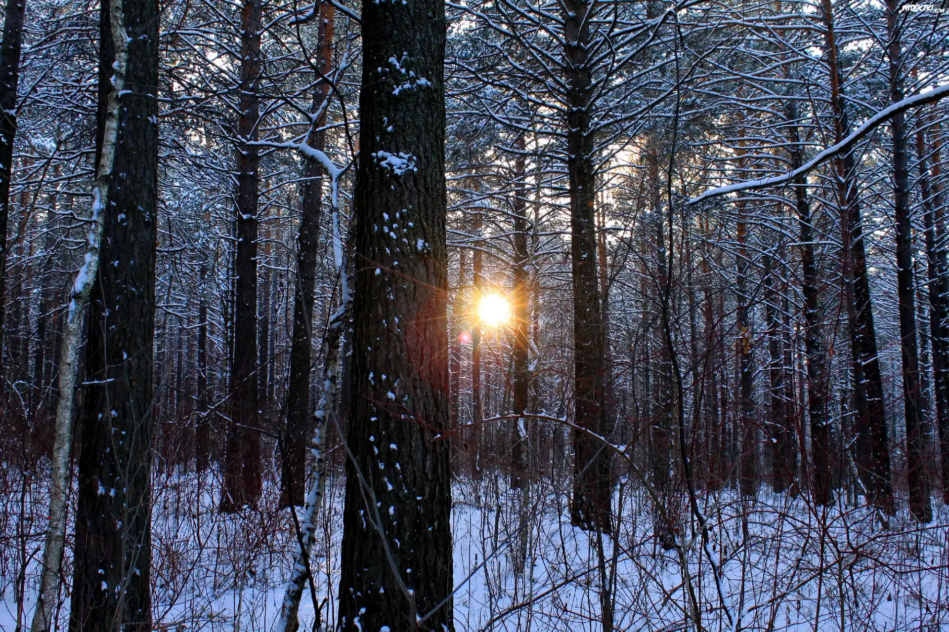 Zdjęcia, Las, Drzewa, Prześwitujące, Słońce, Zima