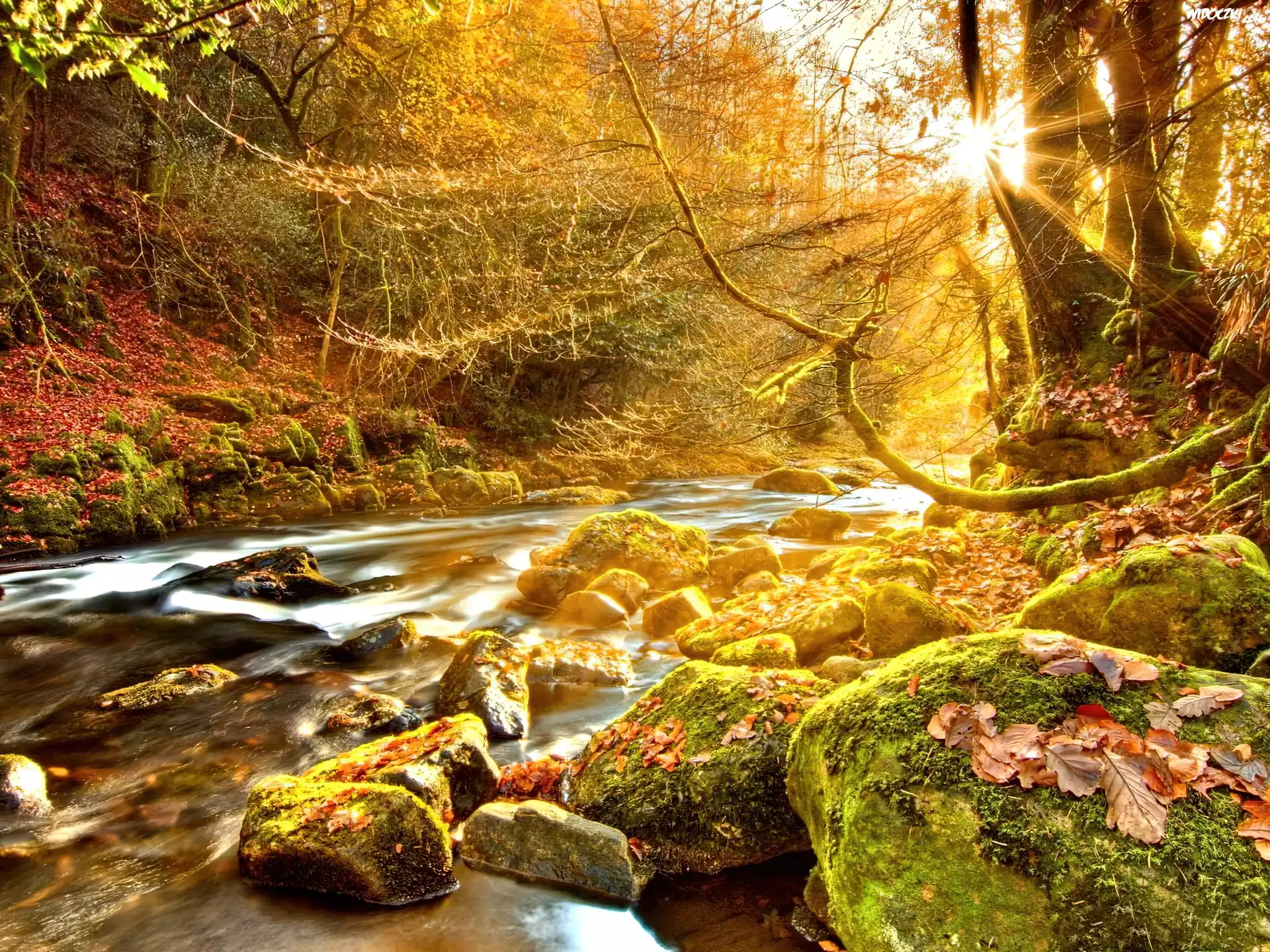 Zdjęcia, Las, Strumyk, Promienie, Słoneczne, Jesień