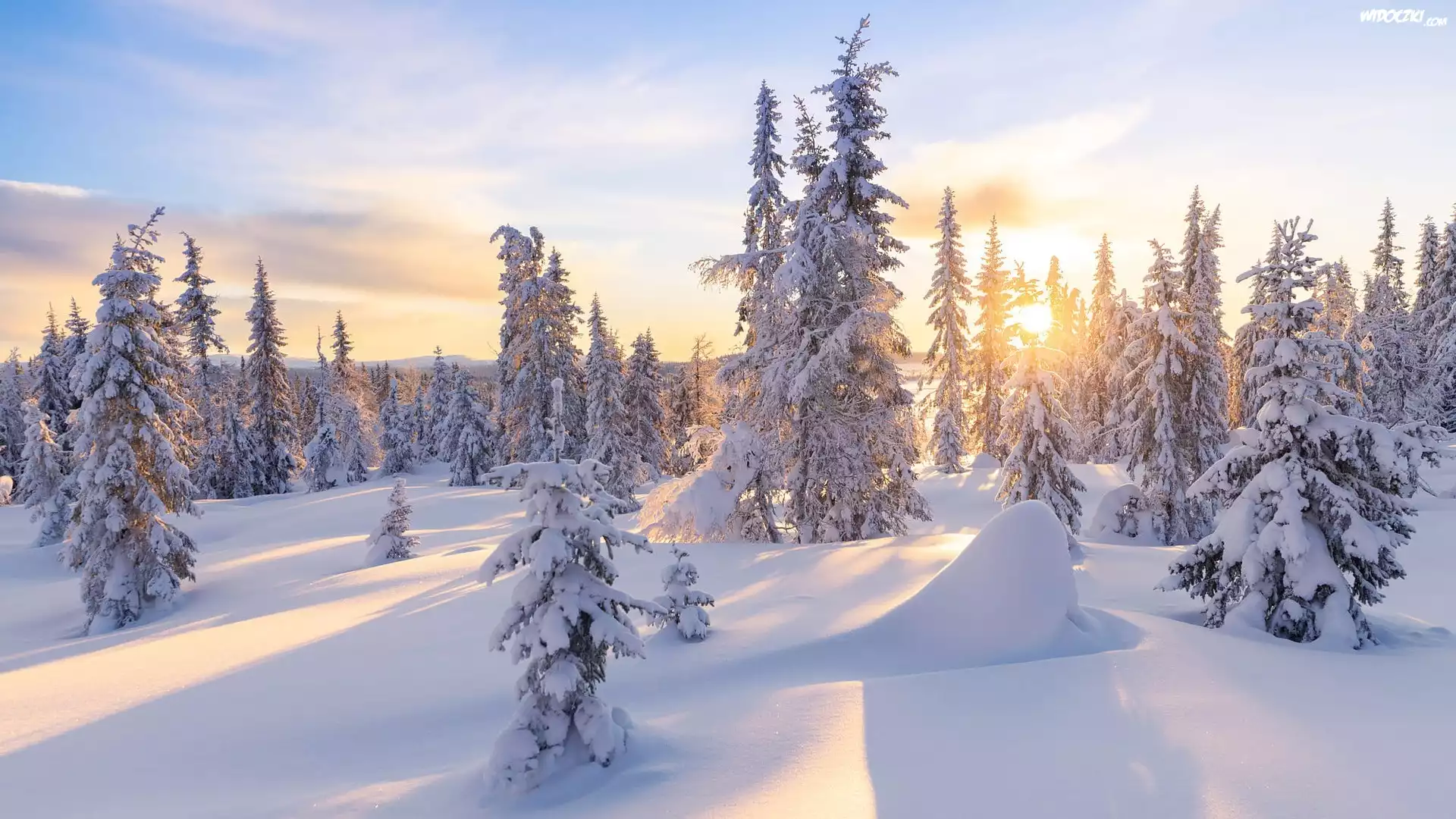 Zdjęcia, Zima, Ośnieżone, Drzewa, Las, Słońce, Śnieg