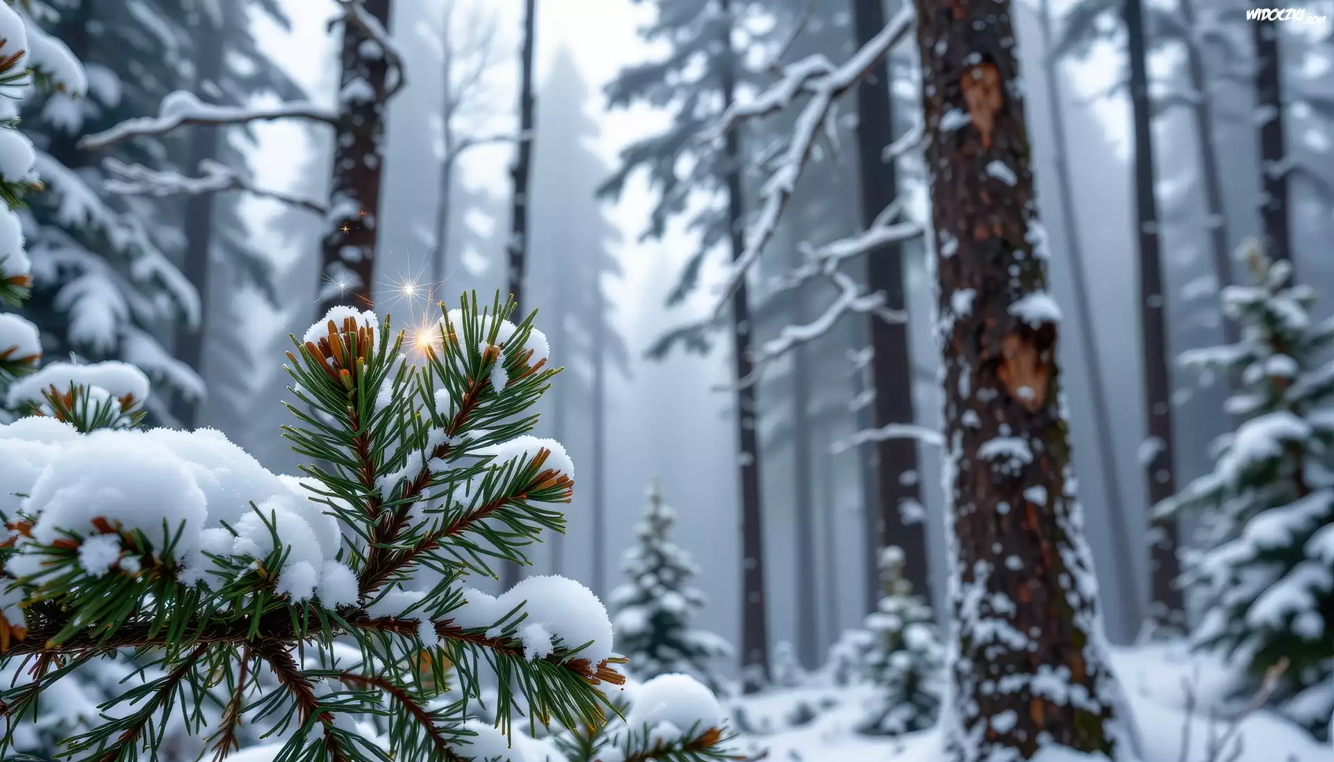 Zdjęcia, Gałązka, Sosna, Śnieg, Las, Zima, Grafika AI