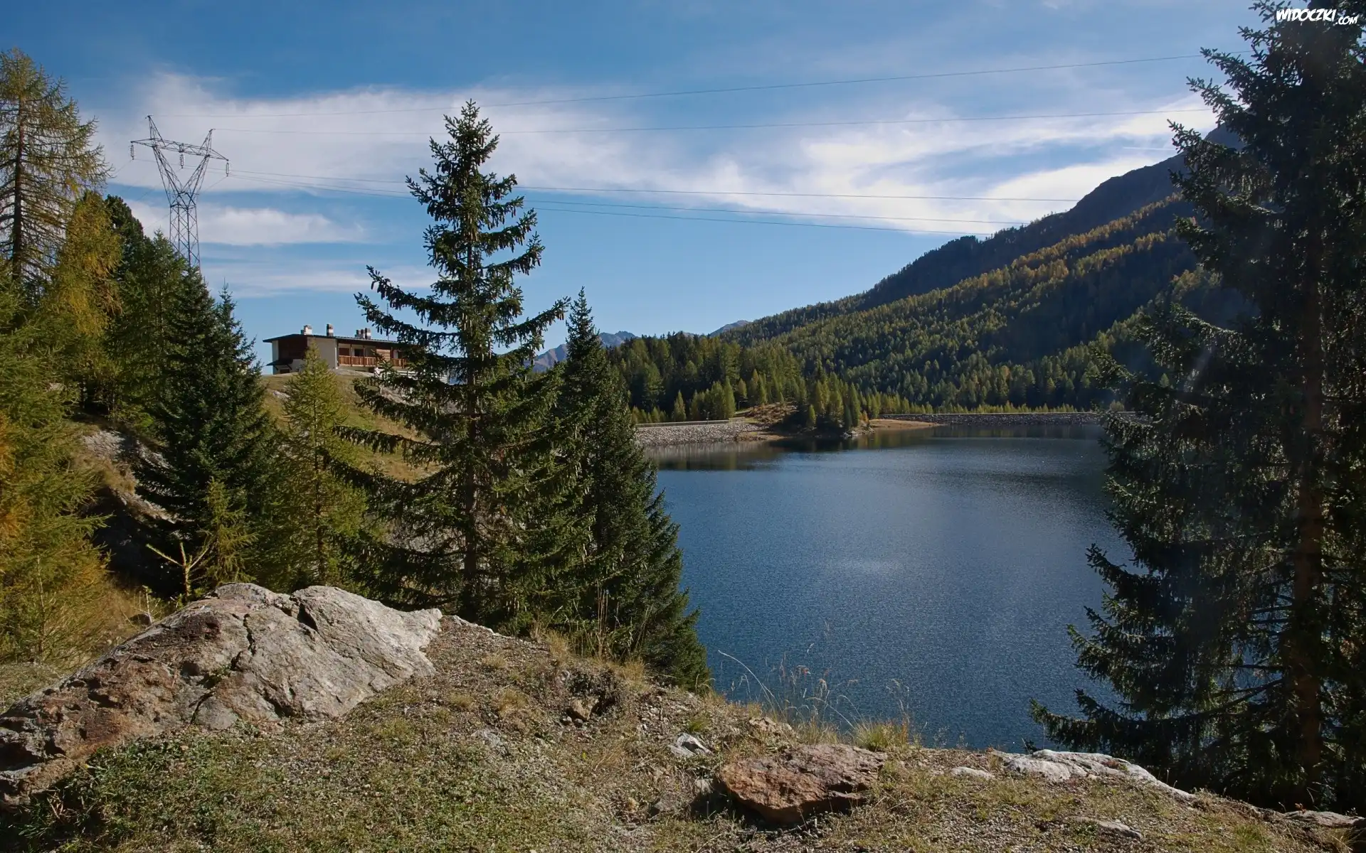 Zdjęcia, Las, Domek, Jezioro, Drzewa, Stacja, Prądu