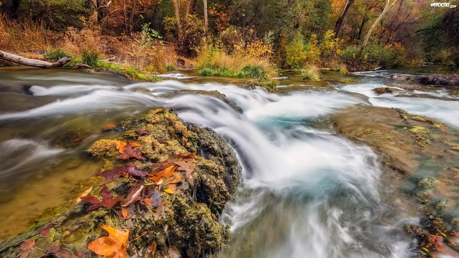 Zdjęcia, Las, Drzewa, Potok, Fossil Creek, Kamienie, Liście, Arizona, Stany Zjednoczone