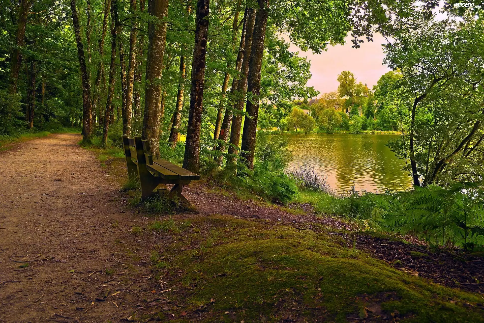 Zdjęcia, Las, Dróżka, Ławka, Staw, Budynki