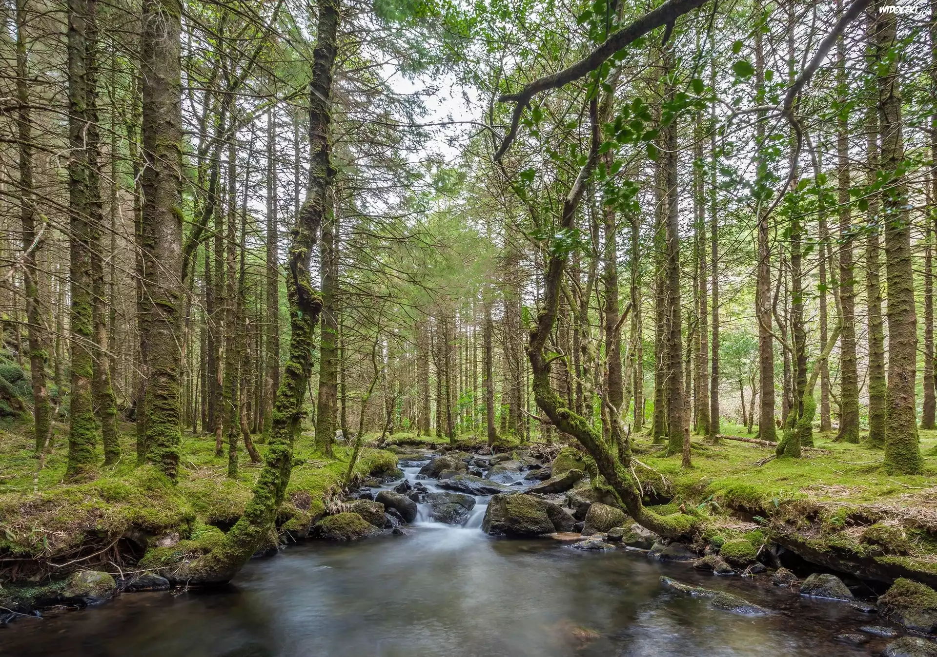 Zdjęcia, Las, Omszałe, Drzewa, Kamienie, Strumyk, Rzeka