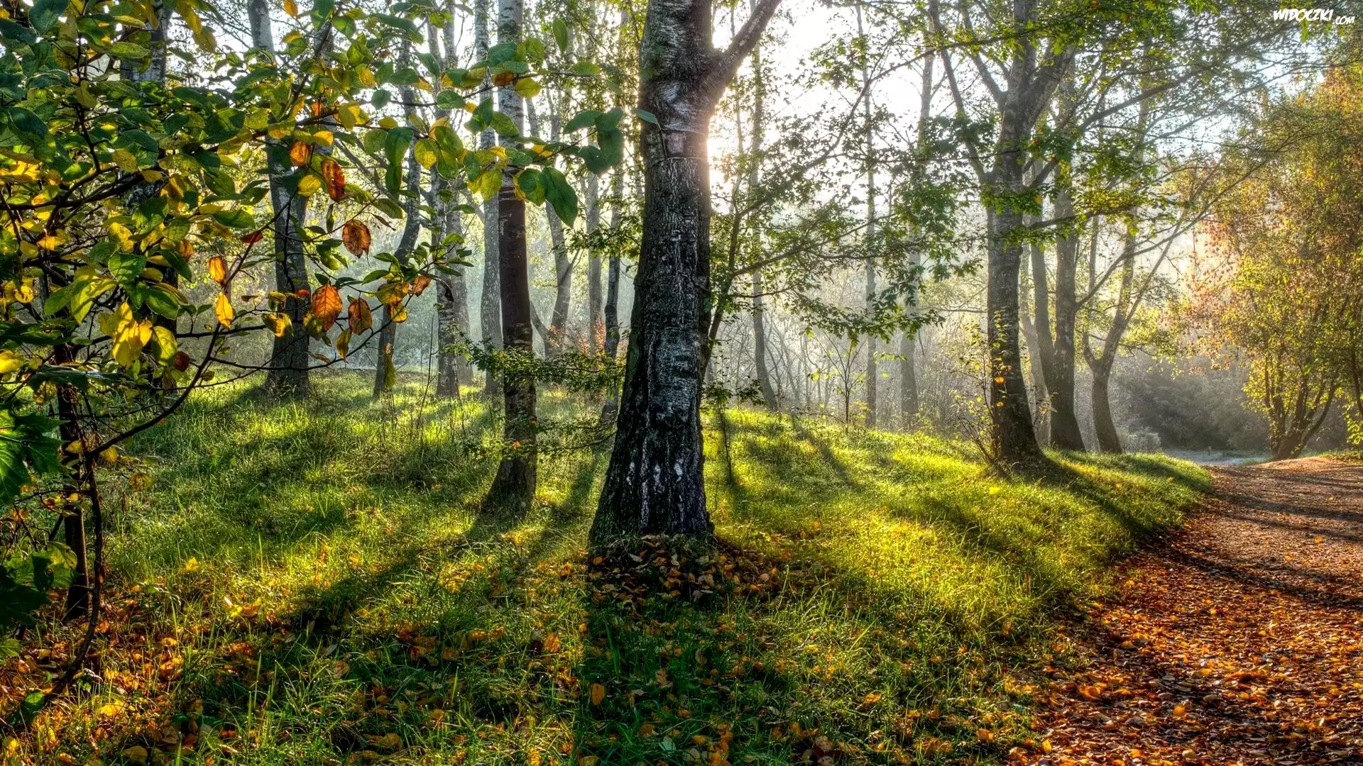 Zdjęcia, Las, Drzewa, Przebijające światło, Ścieżka