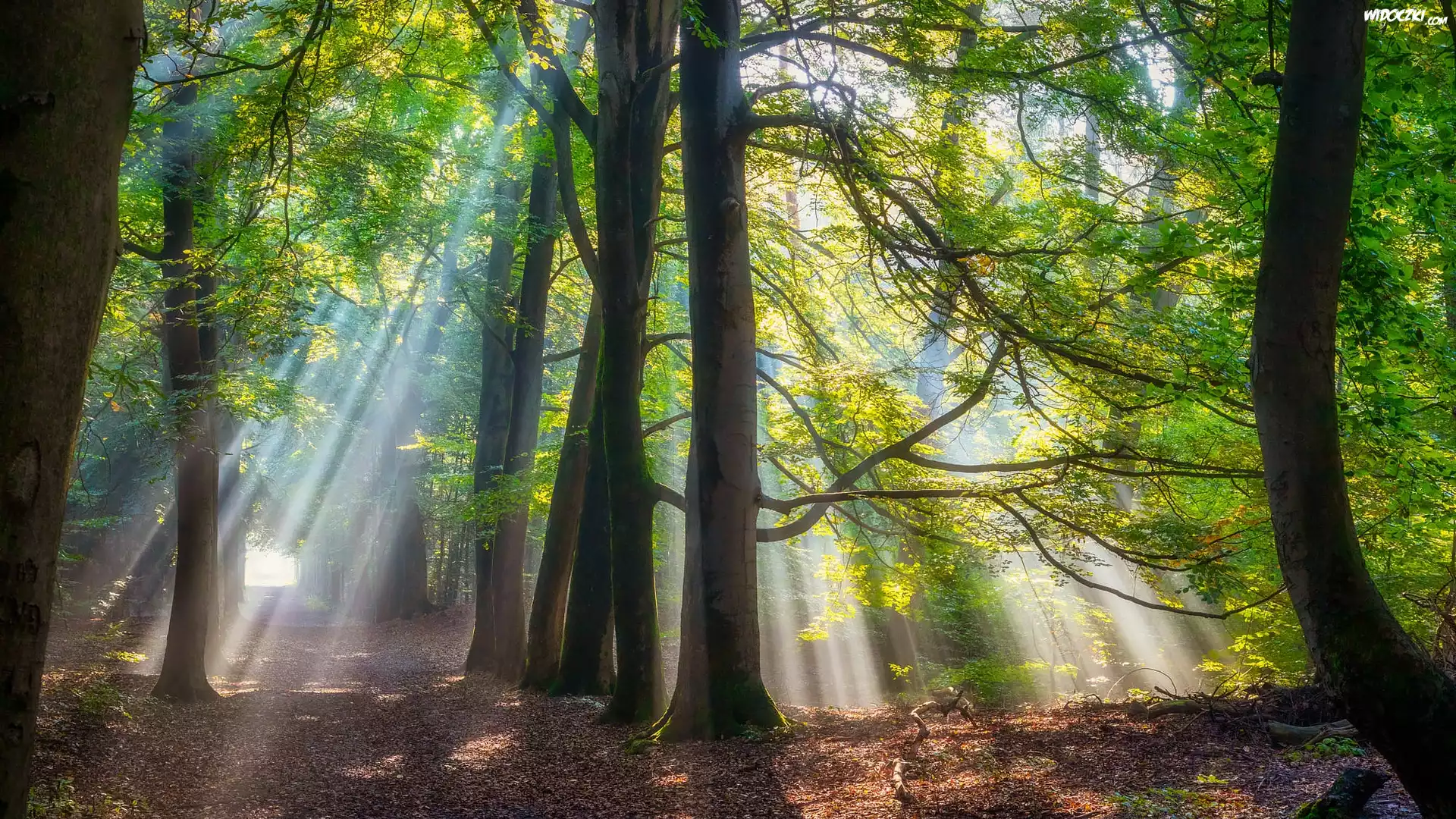Las, Drzewa, Ścieżka, Drzewa, Mgła, Liście, Gałęzie, Przebijające światło, Słoneczne