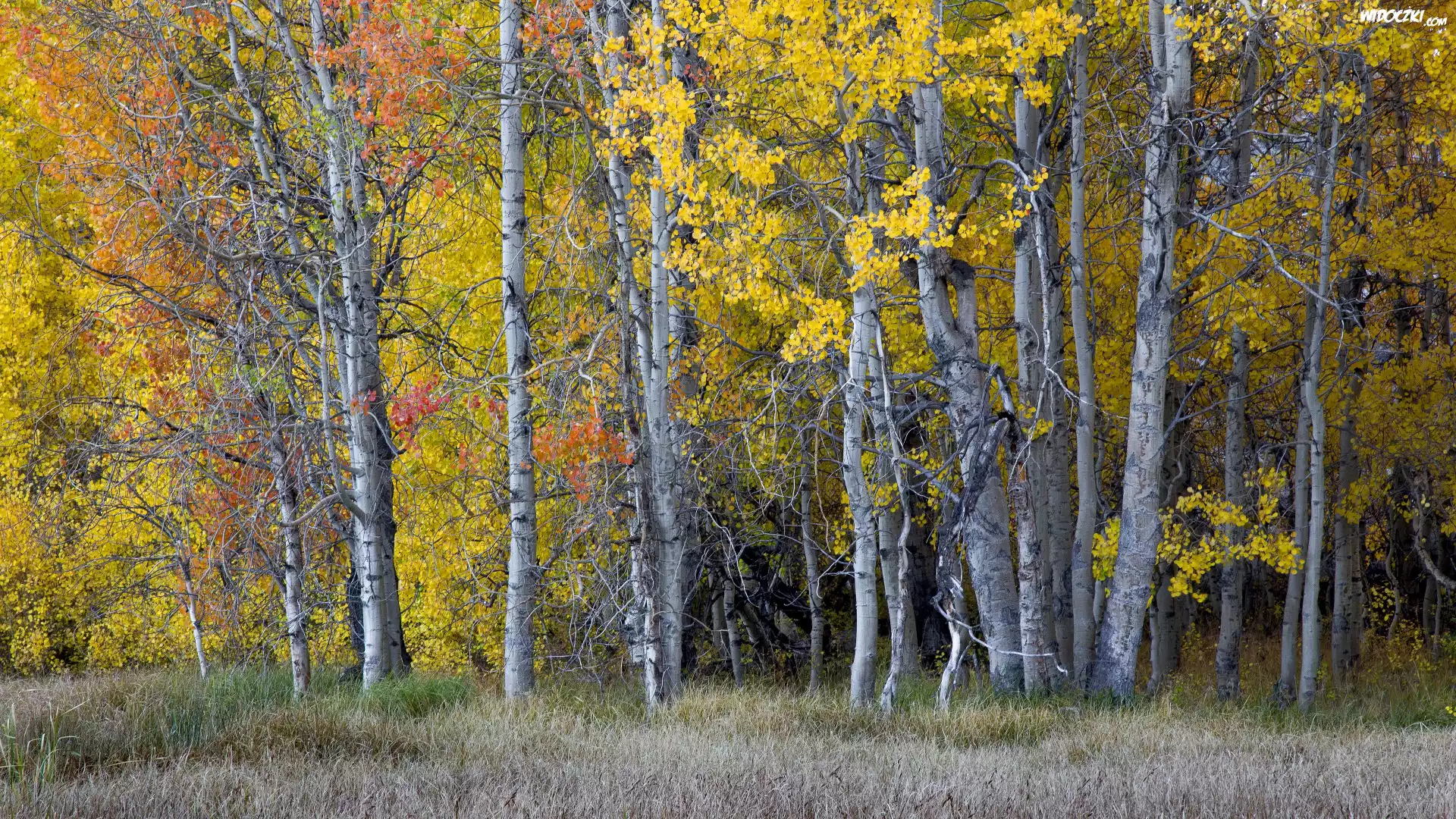 Zdjęcia, Jesień, Las, Trawa, Drzewa, Liście