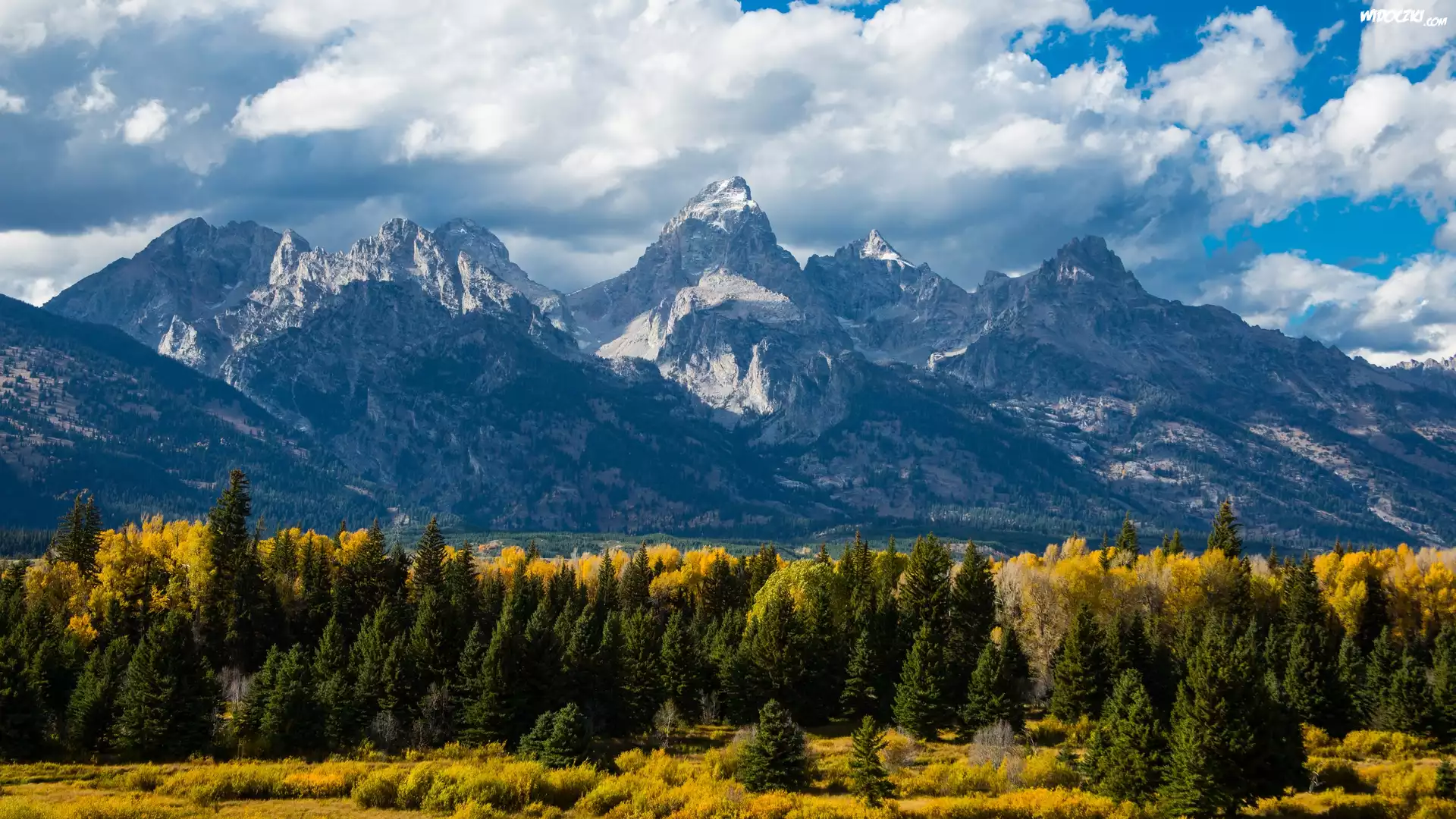Zdjęcia, Stany Zjednoczone, Utah, Park Narodowy Grand Teton, Góry, Chmury, Las, Drzewa, Jesień