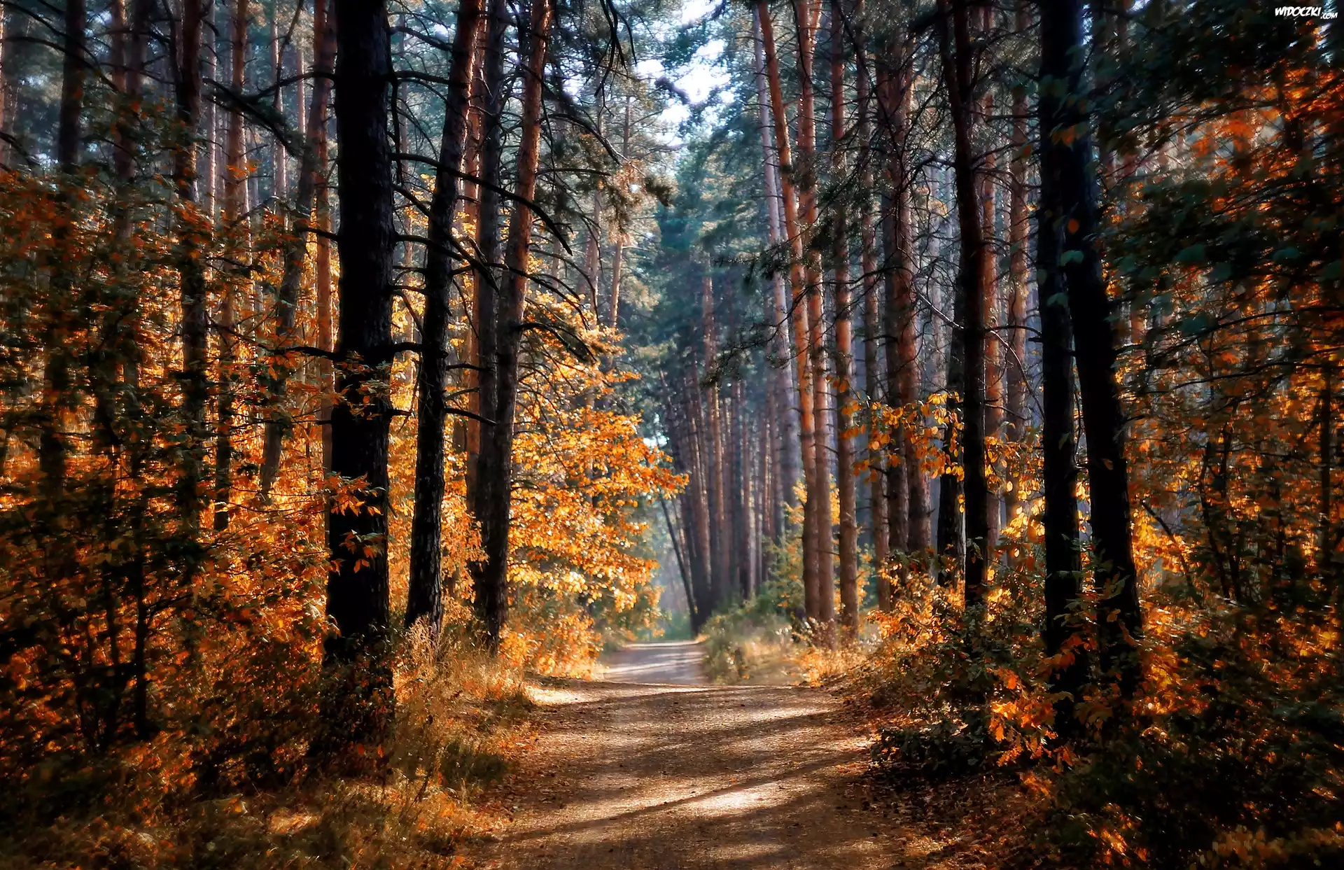 Las, Droga, Drzewa, Przebijające, Światło, Jesień