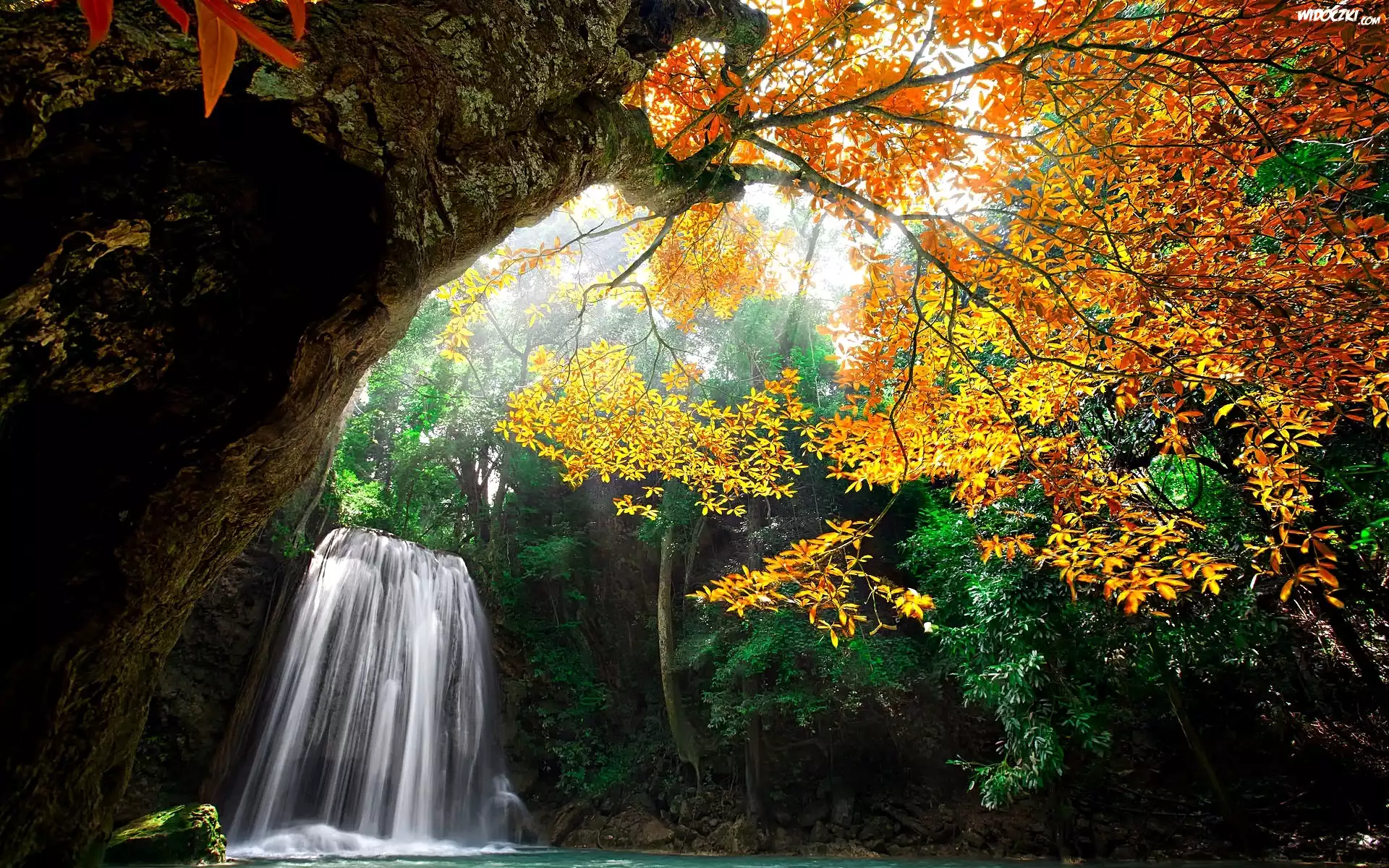 Las, Wodospad, Drzewo, Przebijające Światło, Jesień