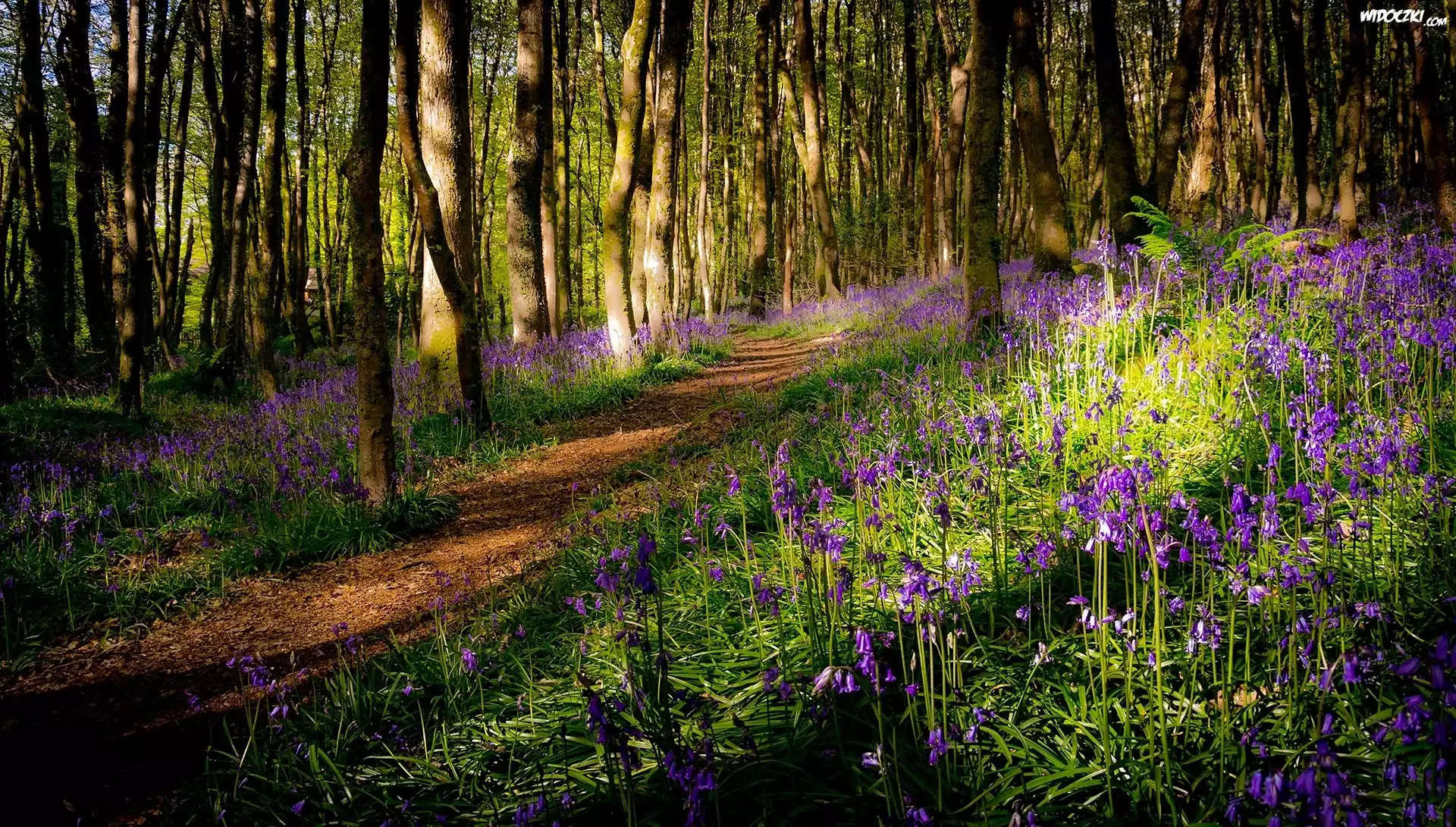 Las, Ścieżka, Kwiaty, Przebijające Światło, Wiosna