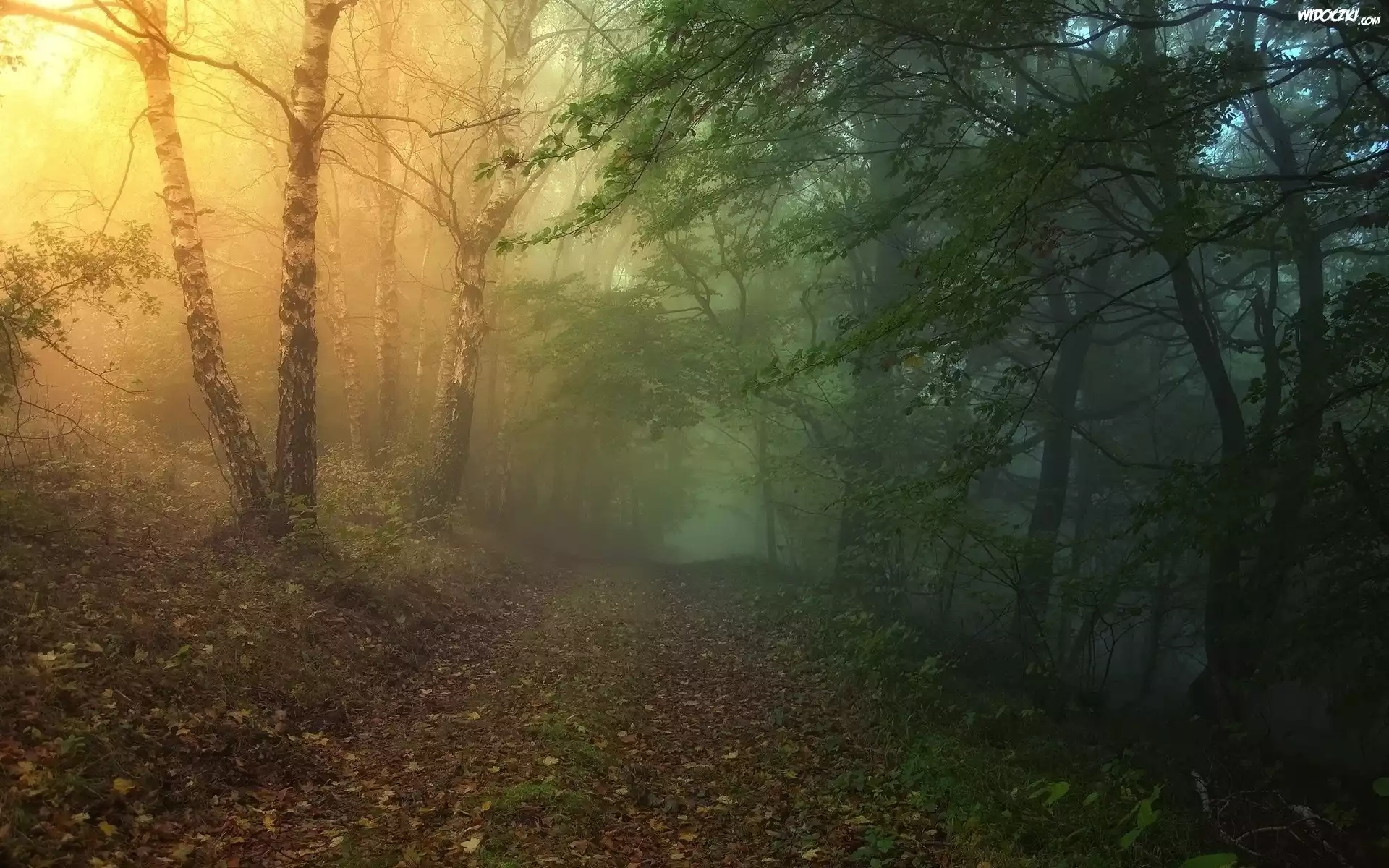 Zdjęcia, Las, Mgła, Liście, Światło, Jesień
