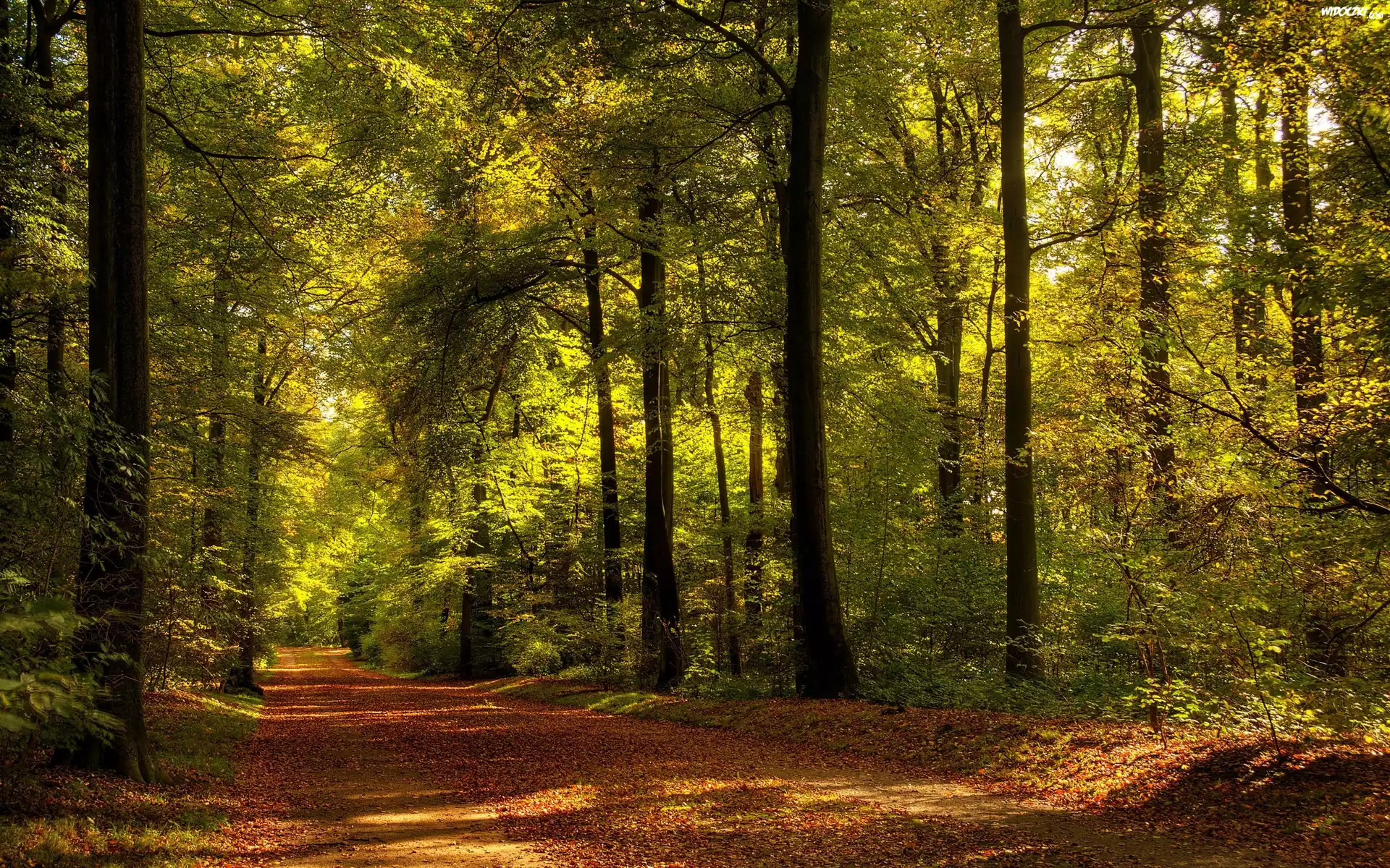 Las, Droga, Liście, Przebijające, Światło, Jesień