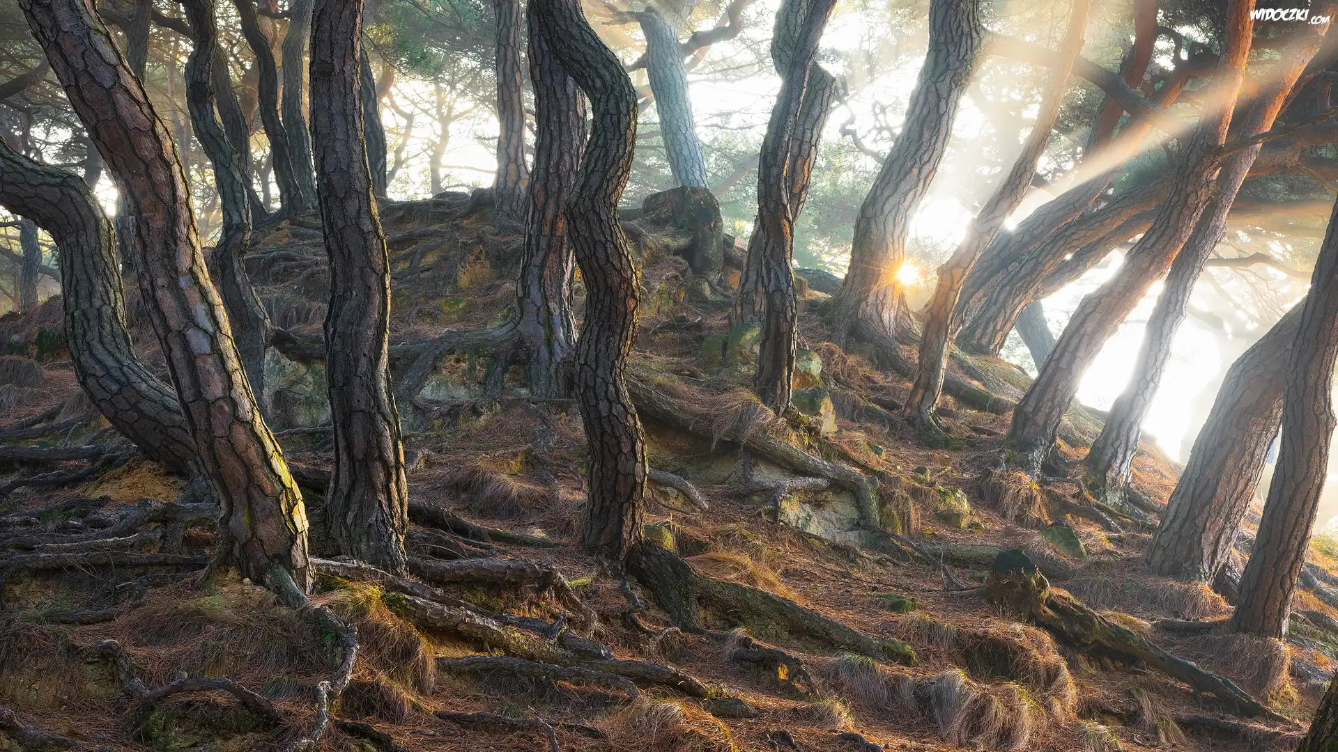 Zdjęcia, Las, Drzewa, Pnie, Sosny, Światło, Słoneczne