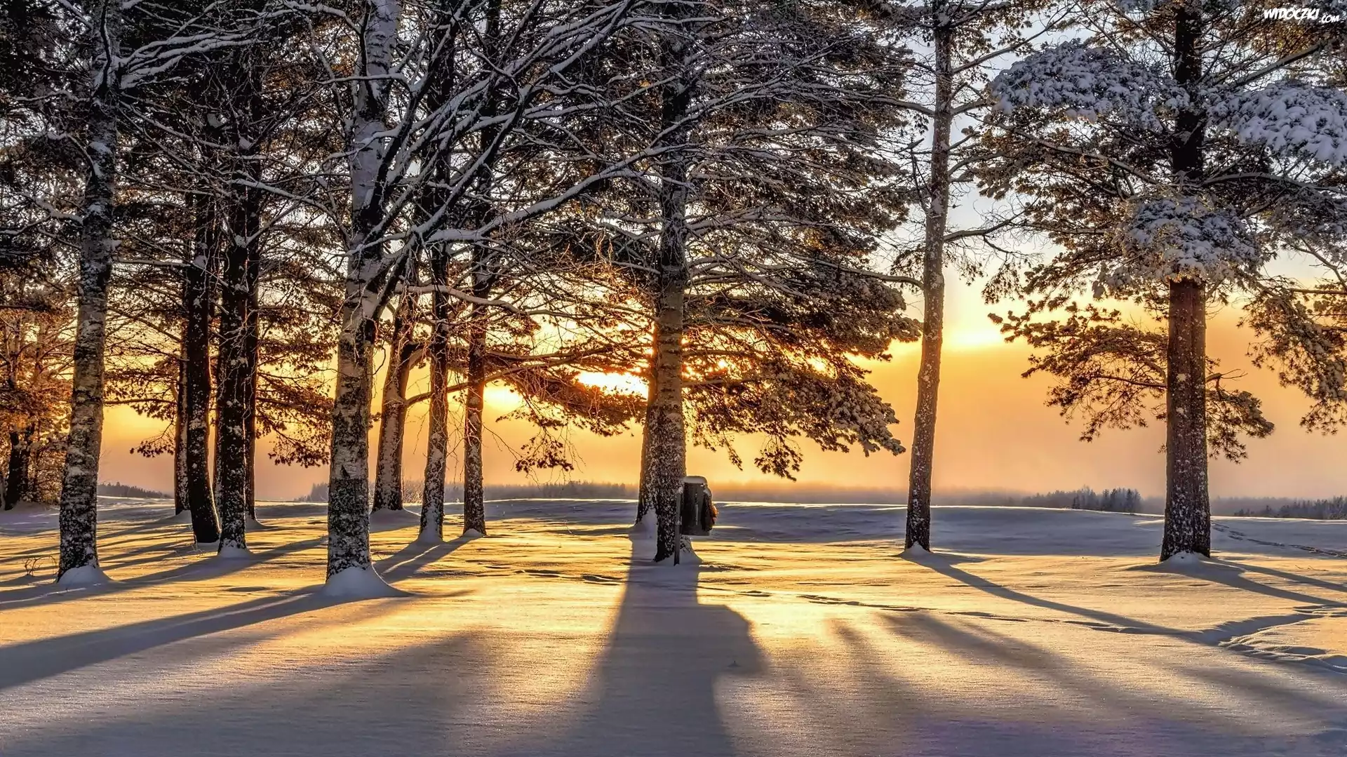Zdjęcia, Las, Drzewa, Przebijające światło, Świt, Zima