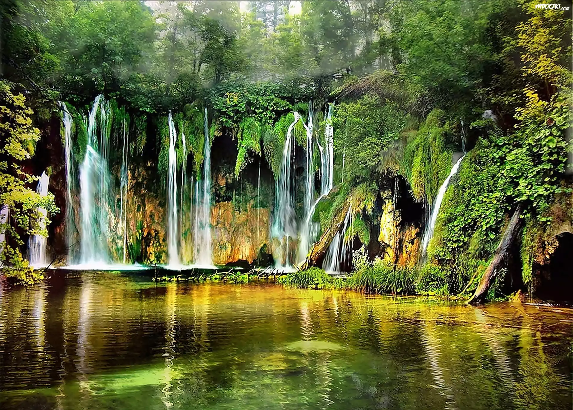 Jezioro, Złote, Drzewa Las, Trawa Przebijające Światło Morze, Skały, Windsurfing Góra, Skały Wodospad Las, Wysuszona, Trawa Las, Bambusowy, Japonia, Droga Wodospad Skały Skała, Morze Morze, Śródziemne, Skałki Las, Przebijające, Promienie, Słońca Piękny Wodospad Jezioro, Wodospad, Góry