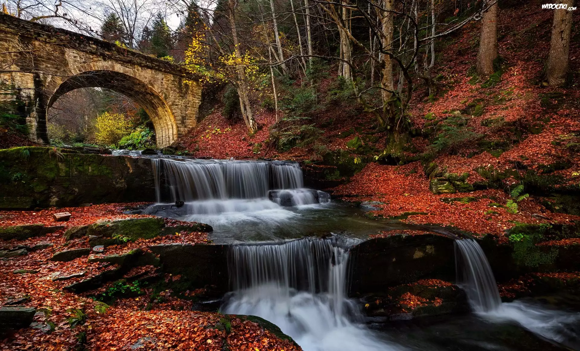Las, Rzeka, Kaskada, Wodospad, Kamienny, Most, Jesień, Liście, Miejscowość Sitowo, Gmina Rodopi, Bułgaria |