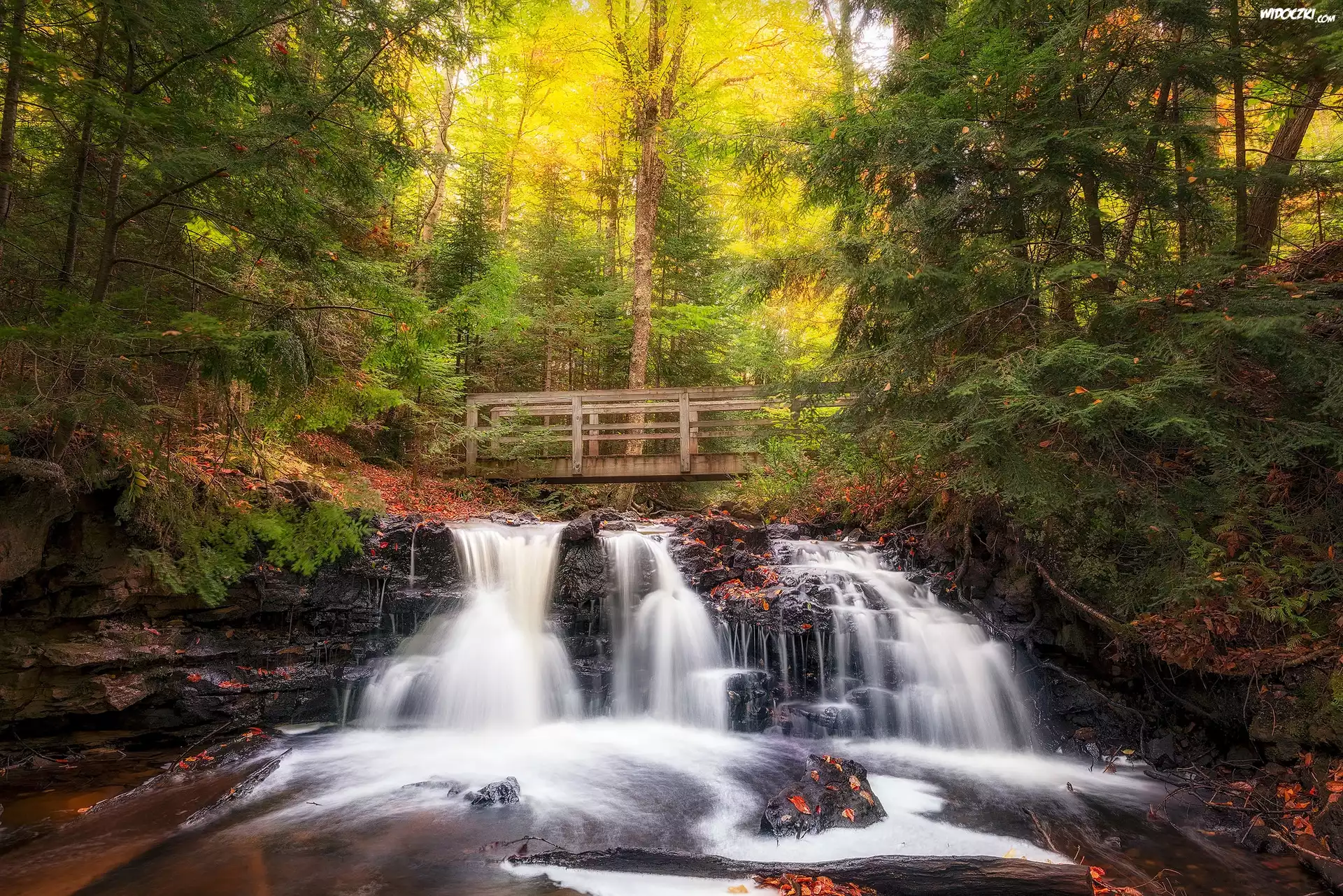Las, Wodospad Chapel Falls, Jesień, Mostek, Park Narodowy Pictured Rocks National Lakeshore, Miejscowość Munising, Stan Michigan, Stany Zjednoczone |