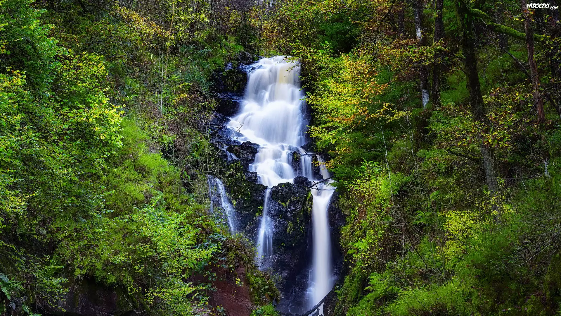 Wodospad, Little Fawn Waterfall, Las, Zarośla, Skały, Park Narodowy Loch Lomond i Trossachs, Szkocja |