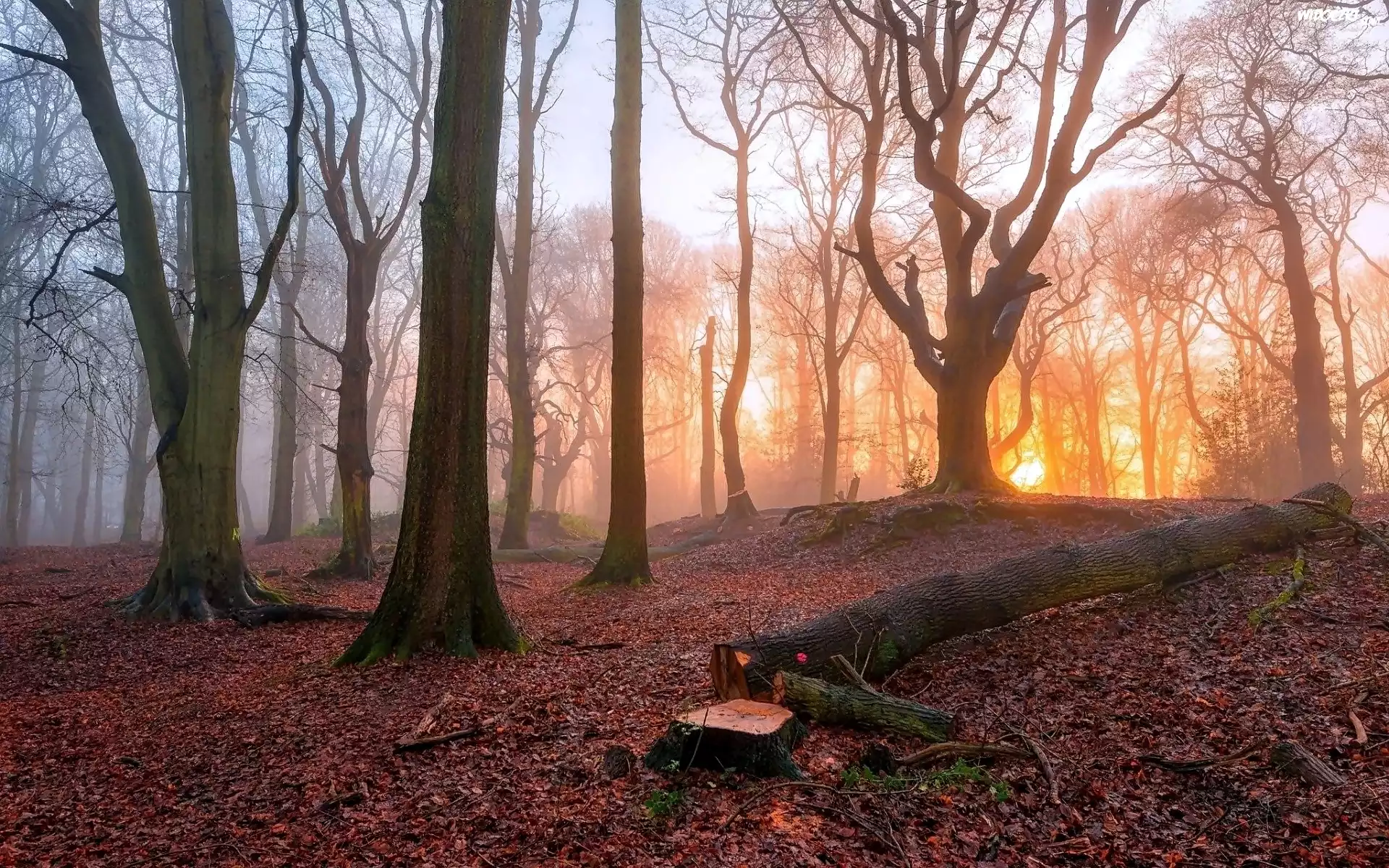 Las, Ścięte, Drzewo, Jesień, Zachód słońca