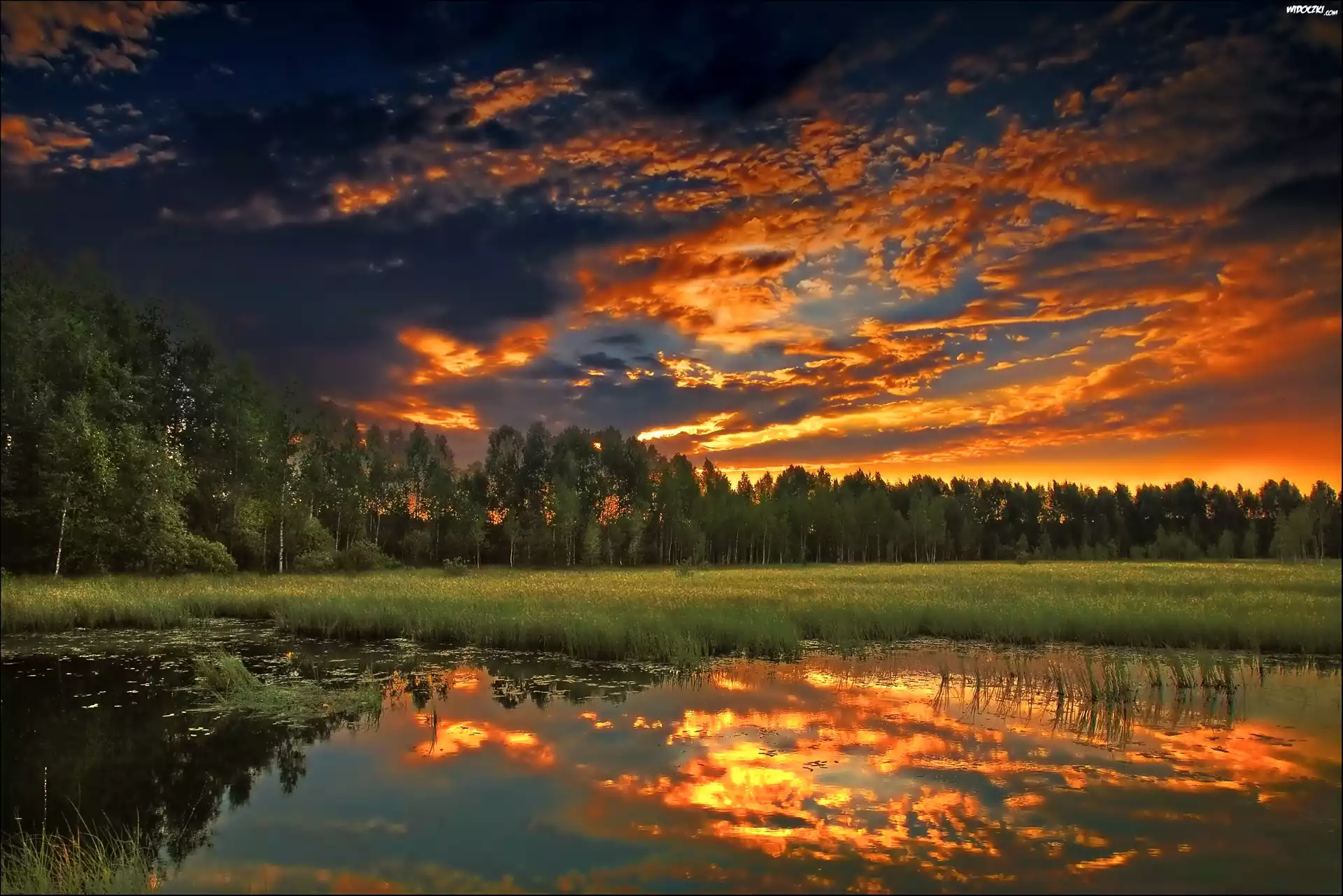 Las, Jezioro, Trzciny, Chmury, Zachód Słońca