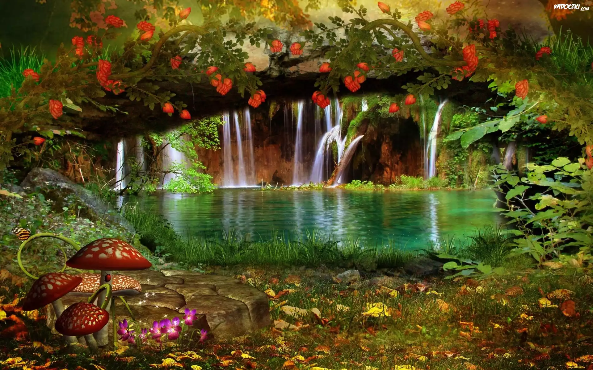 Zdjęcia, Las, Wodospad, Zieleń, Kwiaty