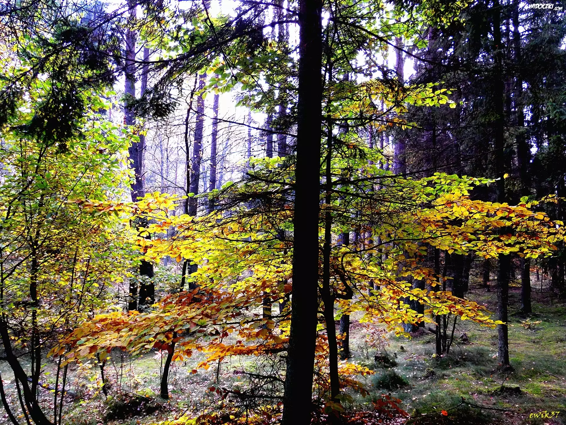 Zdjęcia, Las, Wysokie, Drzewa, Żółte, Zielone, Liście