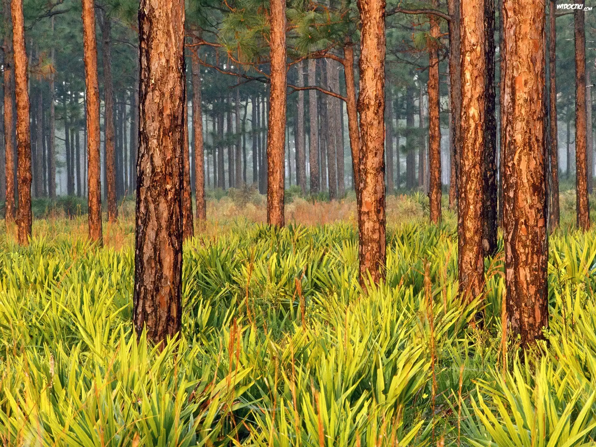 Zdjęcia, Las, Wysokie, Drzewa, Żółto, Zielone, Krzewinki