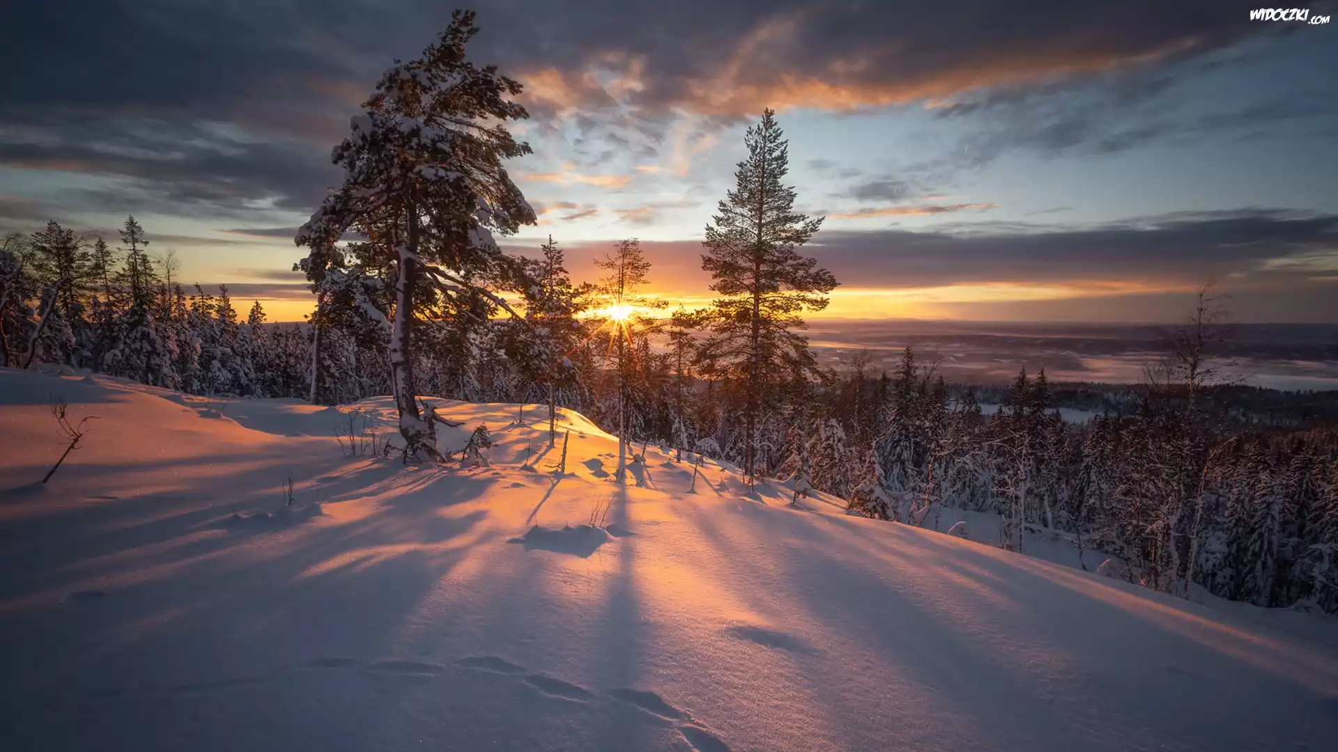 Zdjęcia, Zima, Las, Śnieg, Drzewa, Promienie słońca, Chmury