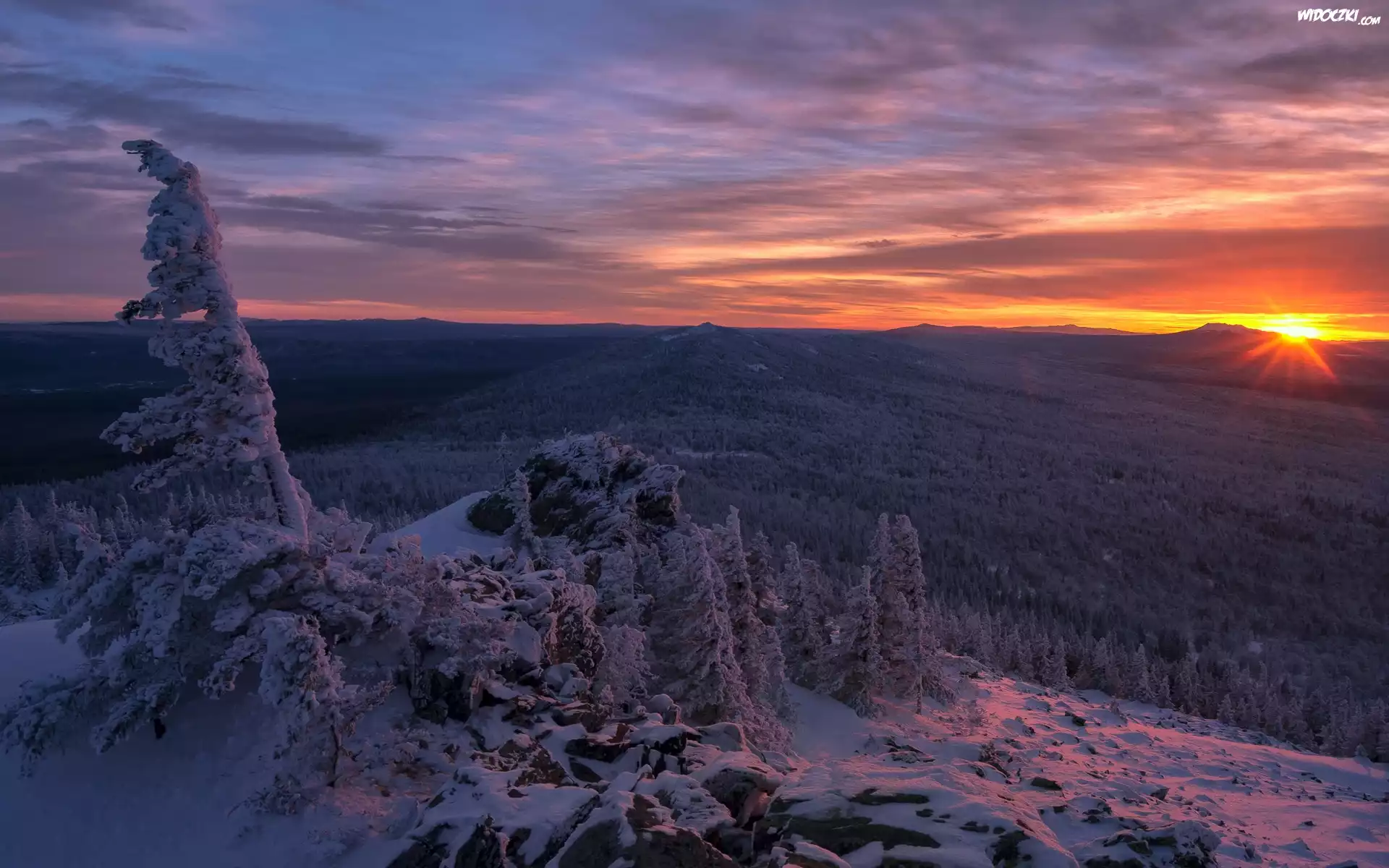 Zima, Las, Drzewa, Rośliny, Zachód słońca, Chmury