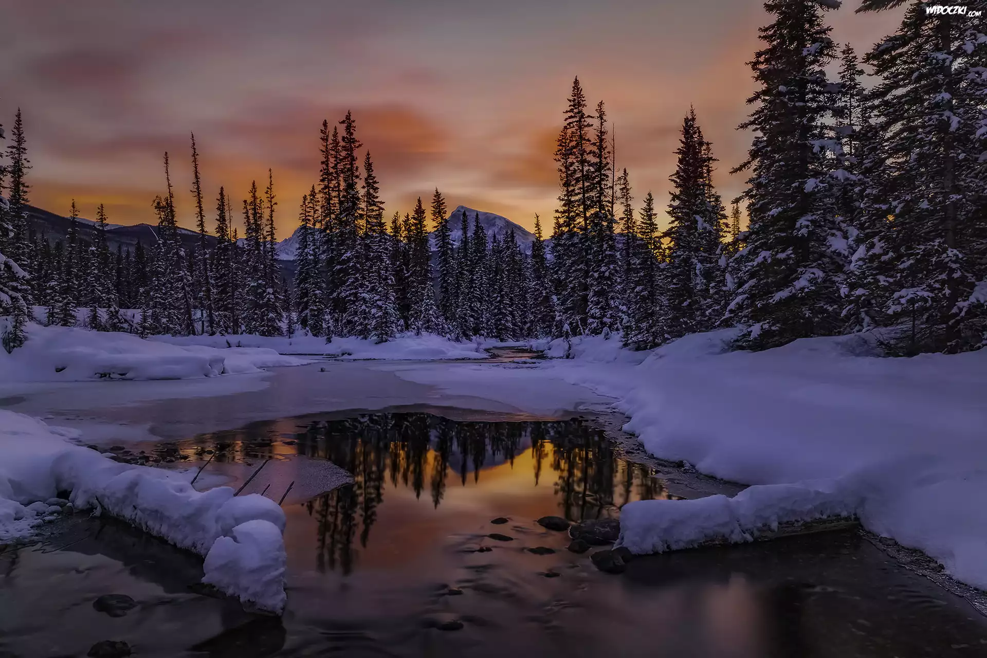 Zdjęcia, Kanada, Park Narodowy Banff, Zima, Las, Rzeka, Zachód Słońca