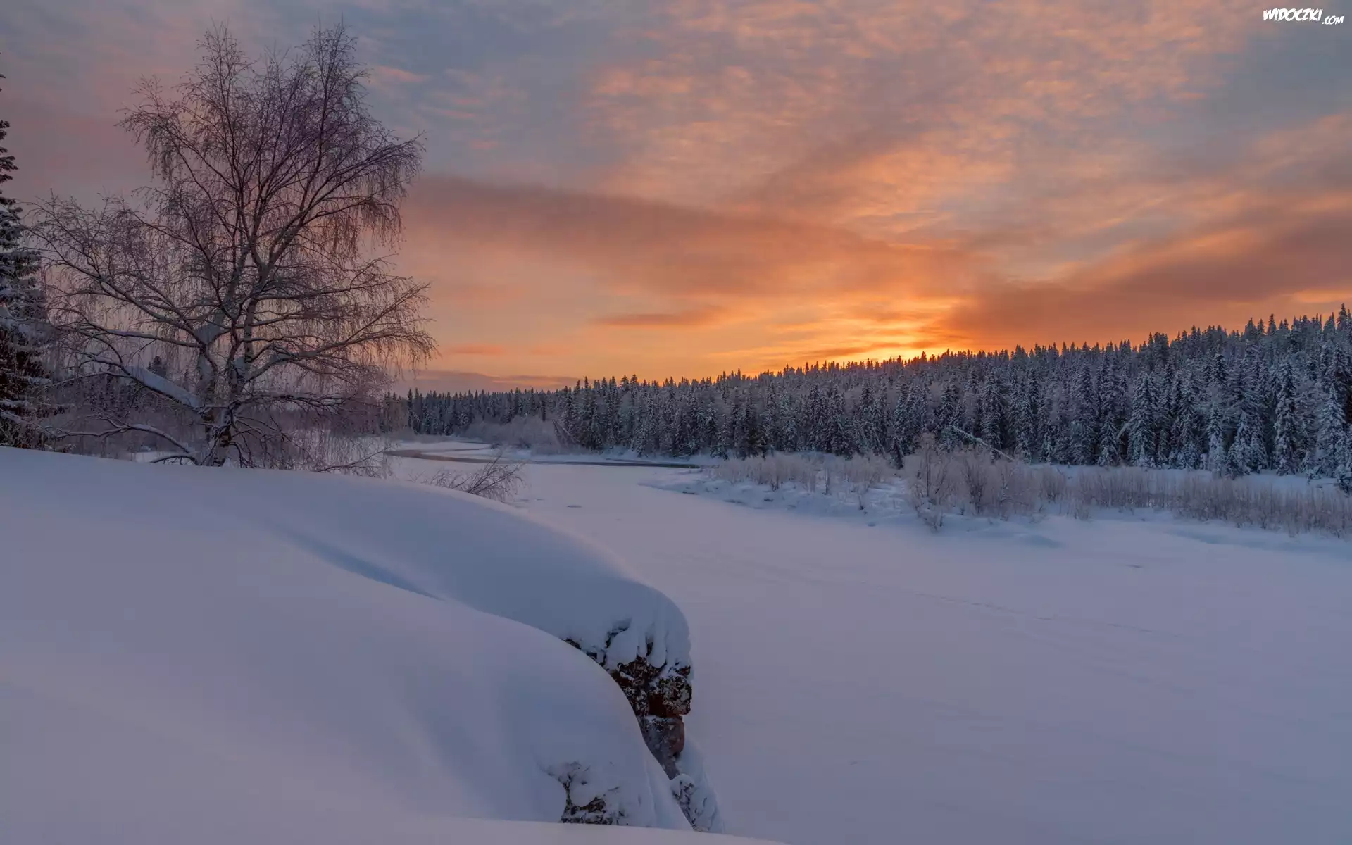 Zdjęcia, Zima, Zaśnieżona, Rzeka Peczora, Drzewa, Las, Zachód słońca, Chmury, Republika Komi, Rosja