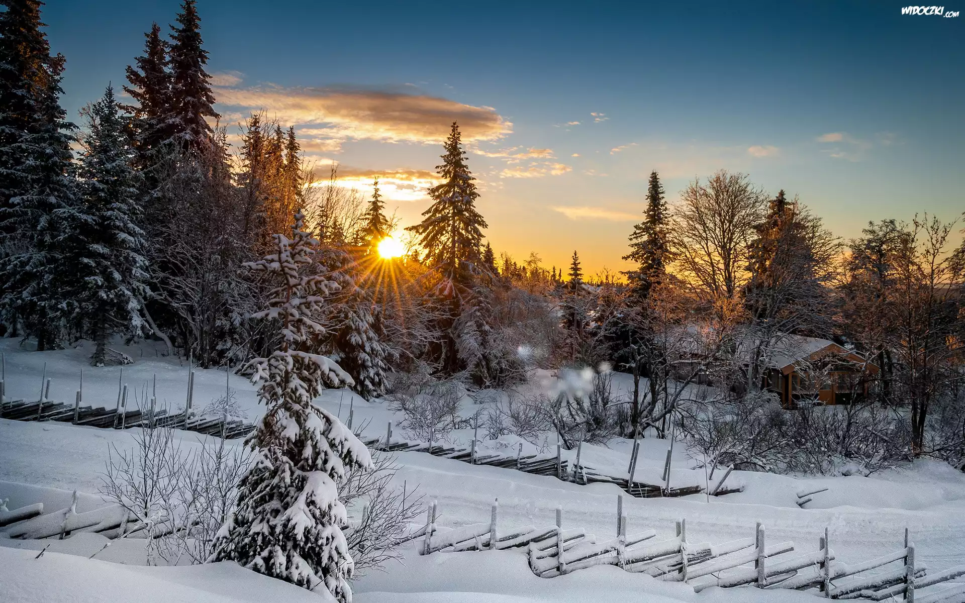 Zima, Las, Drzewa, Drewniany, Domek, Zachód słońca