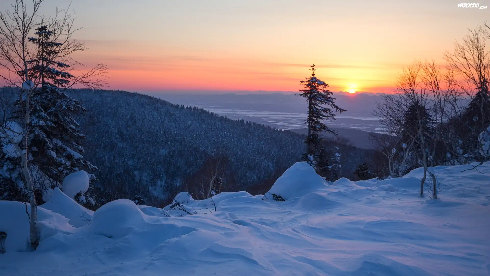 Zima, Las, Drzewa, Góry, Wzgórza, Zachód słońca
