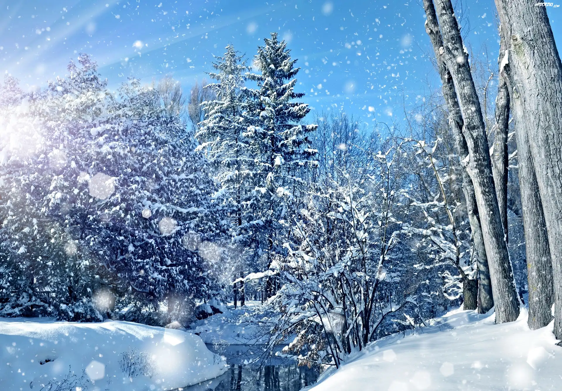 Zdjęcia, Zima, Las, Rzeczka, Promienie słońca, Padający śnieg