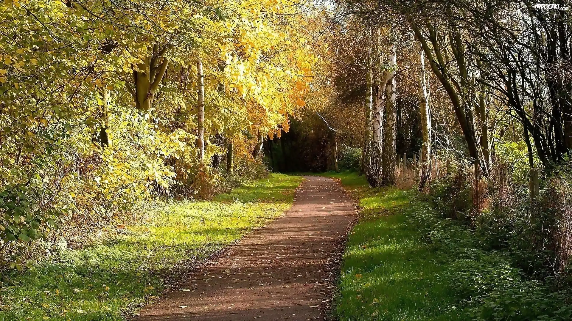 Zdjęcia, Lasek, Brzozowy, Droga, Cienie, Przebijające, Światło
