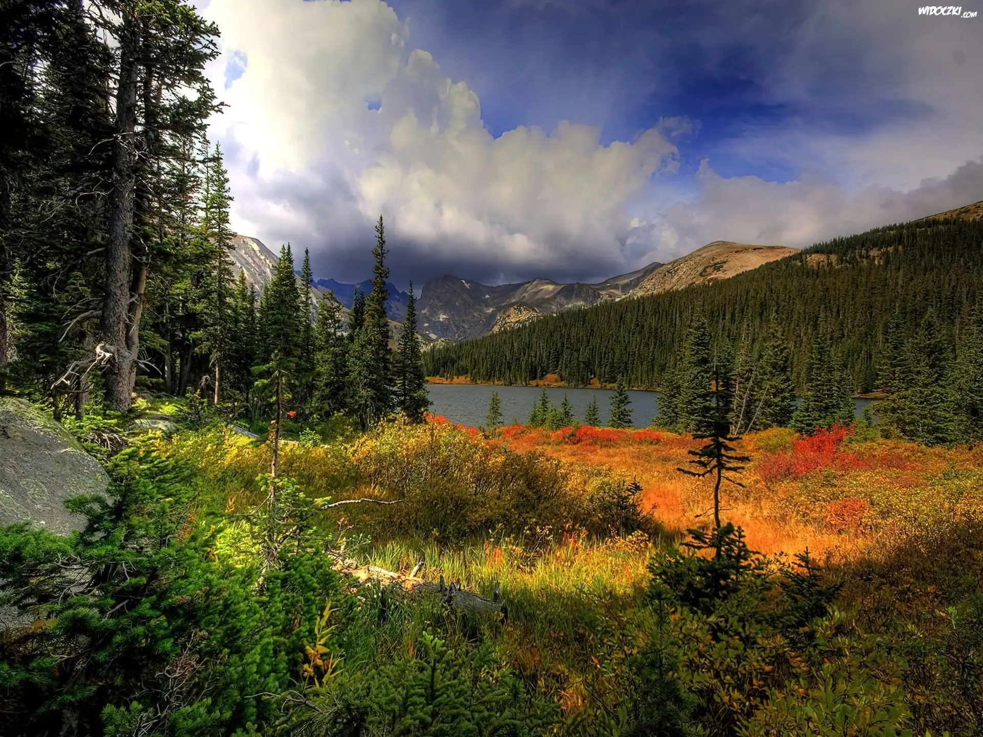 Zdj臋cia, Lasy, Drzewa, Chmury, Jezioro