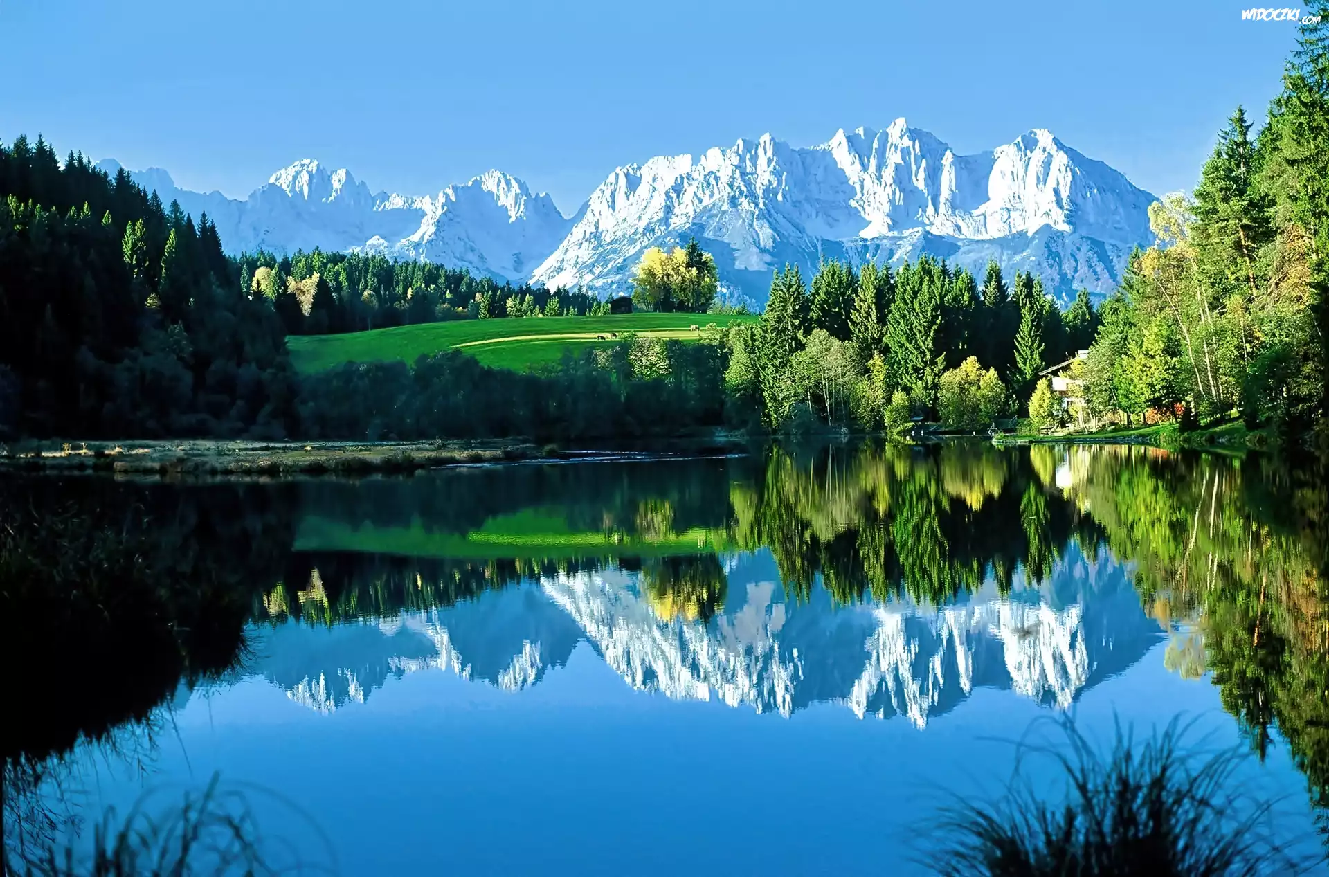 Zdjęcia, Góry, Lasy, Łąki, Jezioro, Odbicie, Światło, Cień