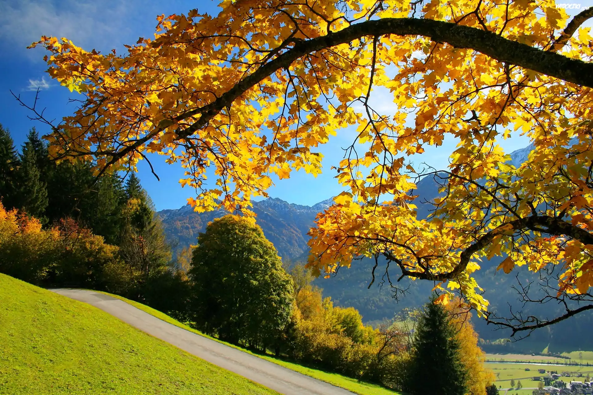 Góry, Lasy, Droga, Dolina, Wioska, Drzewo, Jesień
