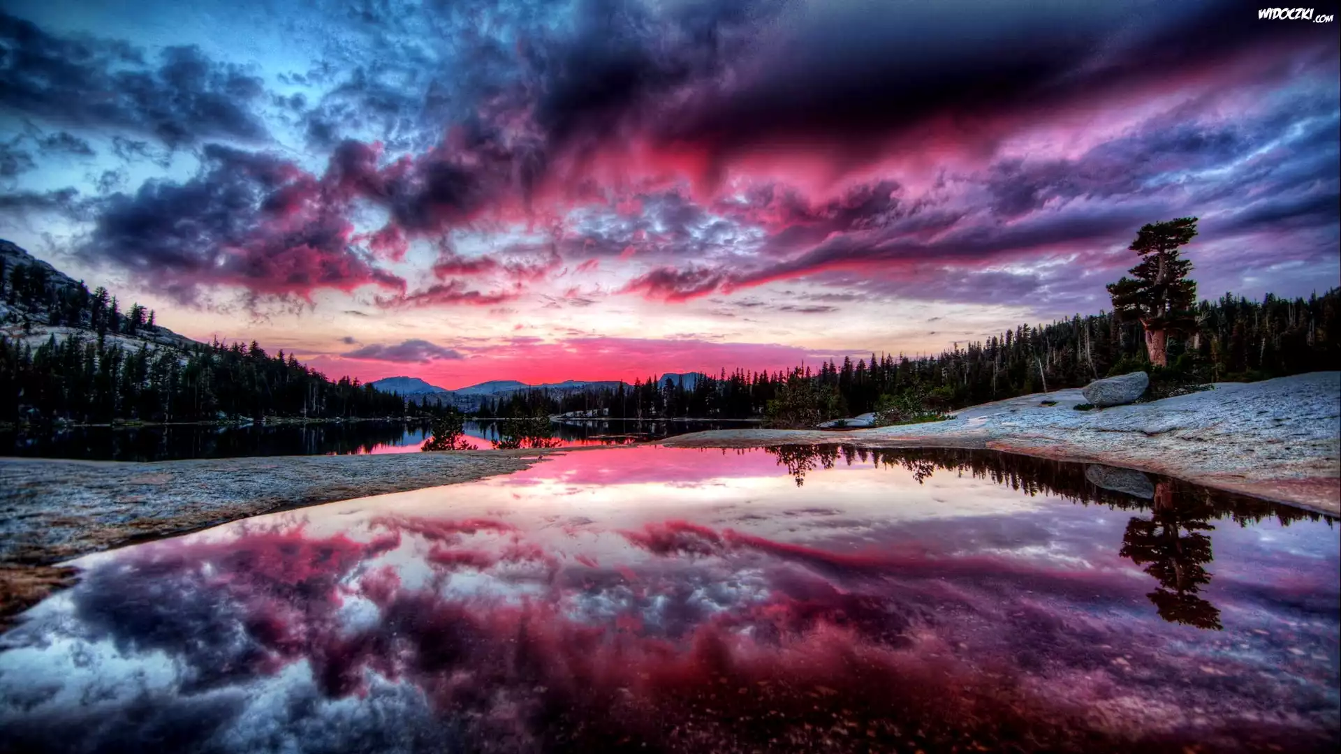 Góry, Lasy, Purpurowy, Zachód Słońca, Jezioro, Odbicie